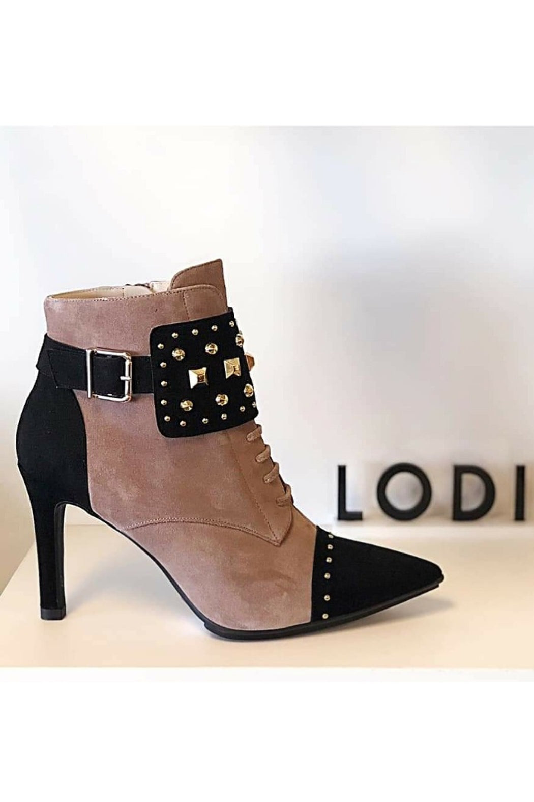 Rimena ankle boot by LODI in brown & black suede and gold metalwork detail. 9.5 cm high heel. The Rimena ankle boot incorporates a new gel insole so that you feel comfortable with each step. It has a side zip closure. Gold metalwork with a pyramid stud detail. A perfect ankle boot model to combine with jeans and a shirt.