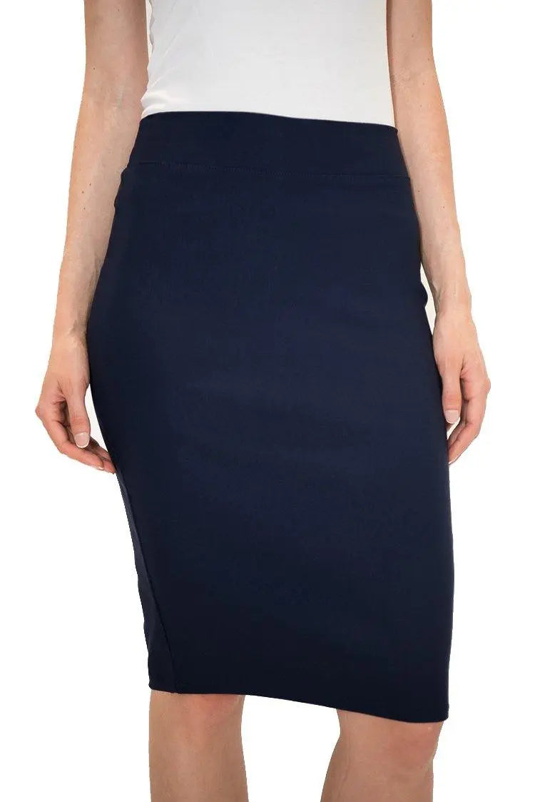 Lightweight pull-on pencil skirt composed of a high-quality millenium fabric (thinner, and a little stiffer than ponti), runs fitted and does not have a seam line in the back. Machine wash cold. Hang to dry.