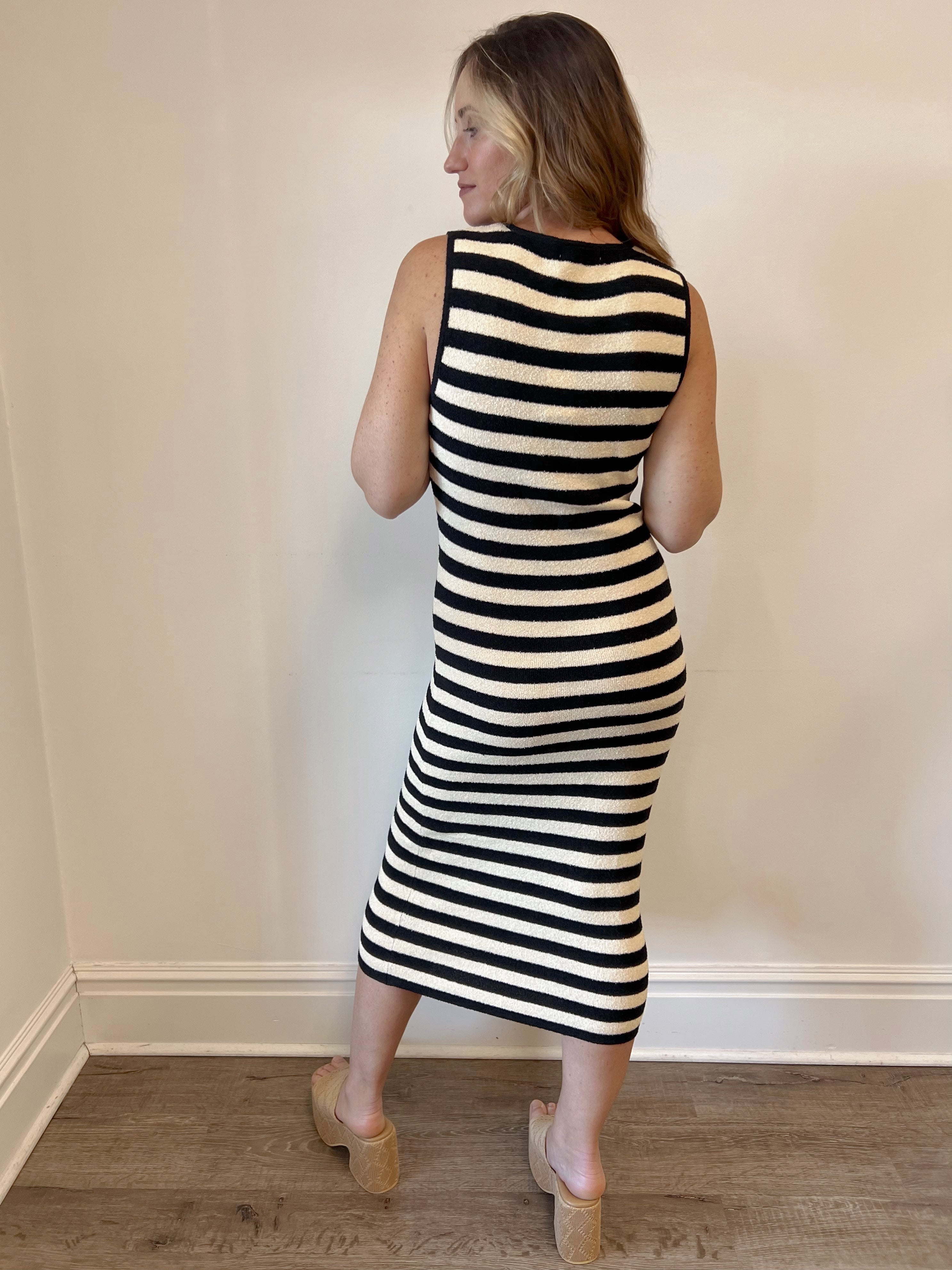 Take a break from boring outfits with our Road Trip Dress. This gorgeous terry-knit maxi dress will have you looking and feeling your best on any adventure. Featuring a classic crewneck and fun, colorful stripes, this dress is perfect for any occasion. Get ready to hit the road in style!