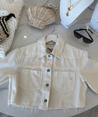 The Robbie Denim Jacket is the perfect spring refresh. With a fun, cropped design and fresh ecru color, you'll stand out in style. The denim material is both light and trendy, making it a must-have addition to your spring wardrobe.