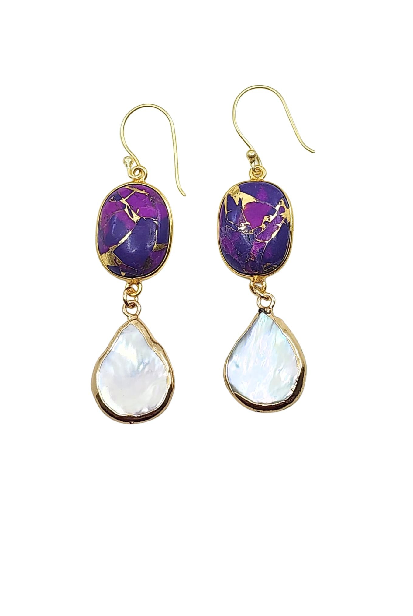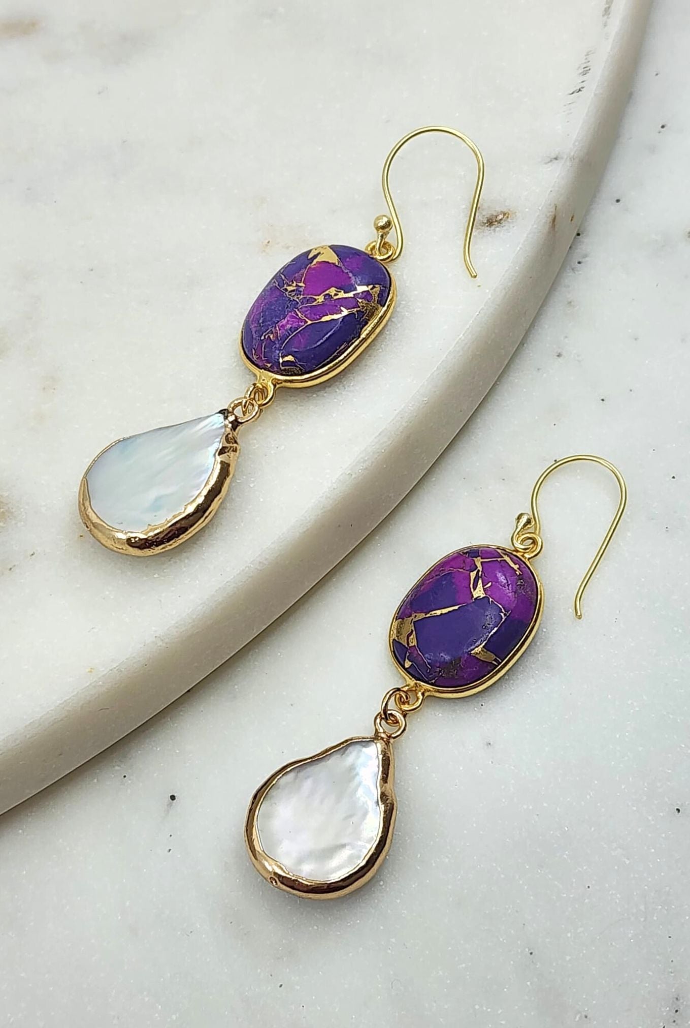 Gold dangle earrings with purple mojave copper turquoise stone and a pearl drop. These will vary slightly due to the individual nature of the stones which are semi-precious and unique.