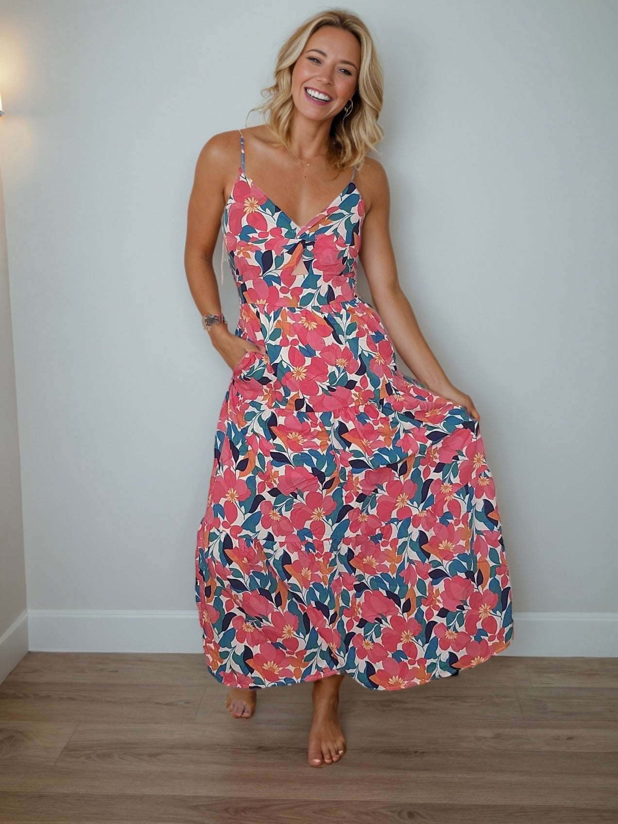 Indulge your bohemian spirit in our Rose Floral Twist Cami Maxi Dress. With a beautiful floral print and elegant twist neckline, this dress is perfect for any occasion. Featuring a tiered cami design and pleats for added texture, it moves gracefully with every step. Made with high-quality materials for comfort and easy care.