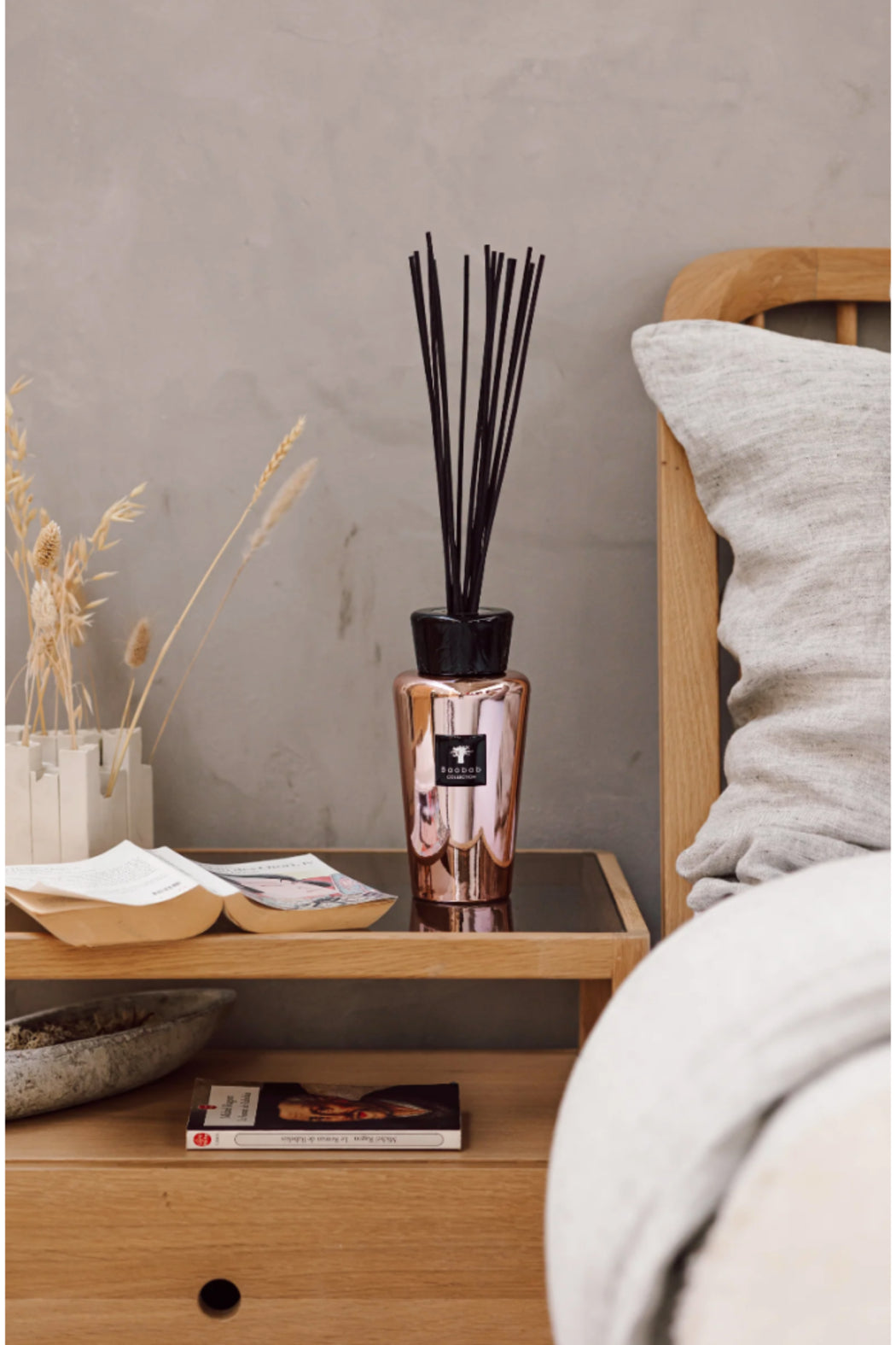 The Totem Roseum perfume diffuser is a beautiful decorative object finished with a ceramic stopper enameled in a gunmetal color. The object thus becomes a jewel and brings an extraordinary shine to your interiors. Both festive and timeless, its refined fragrance will fill your home with a wave of femininity and delicacy.