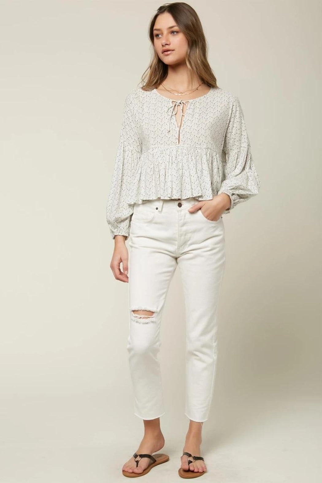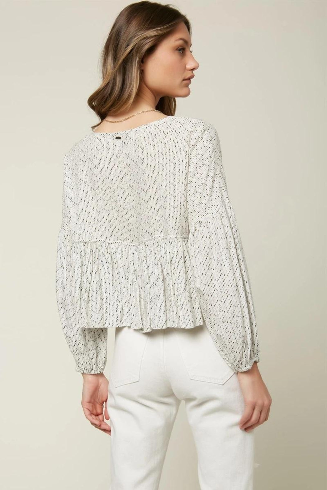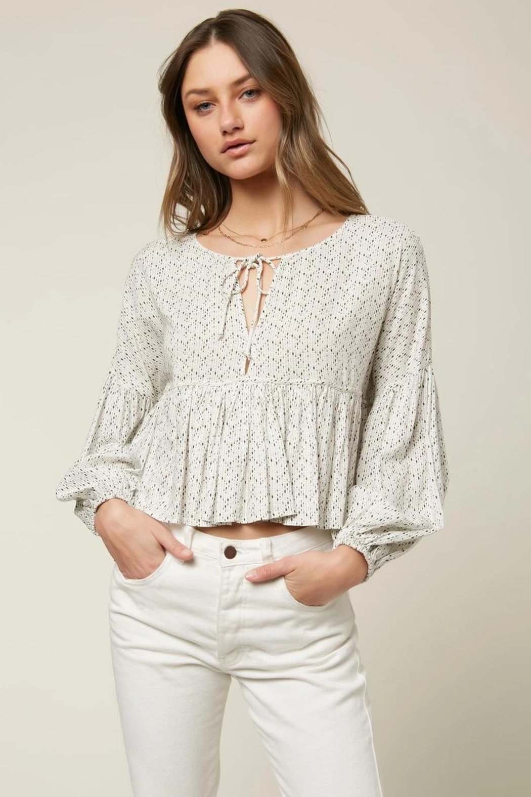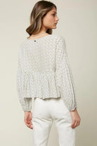 Easy & stylish. This is a long sleeve woven top that has a blouson sleeve design and relaxed fit.