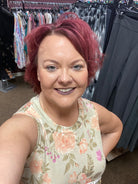 I love this soft floral pattern in a great neutral! With its empire waist accentuated with a lace seam, stretchy peach-skin like material, and tunic length, this one you'll get to wear all year long! Pair with our Style: 3297 Jordyn Ruffle Sleeve Kimono in Natural!