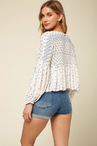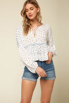 Easy & stylish. This is a long sleeve woven top that has a blouson sleeve design and relaxed fit.