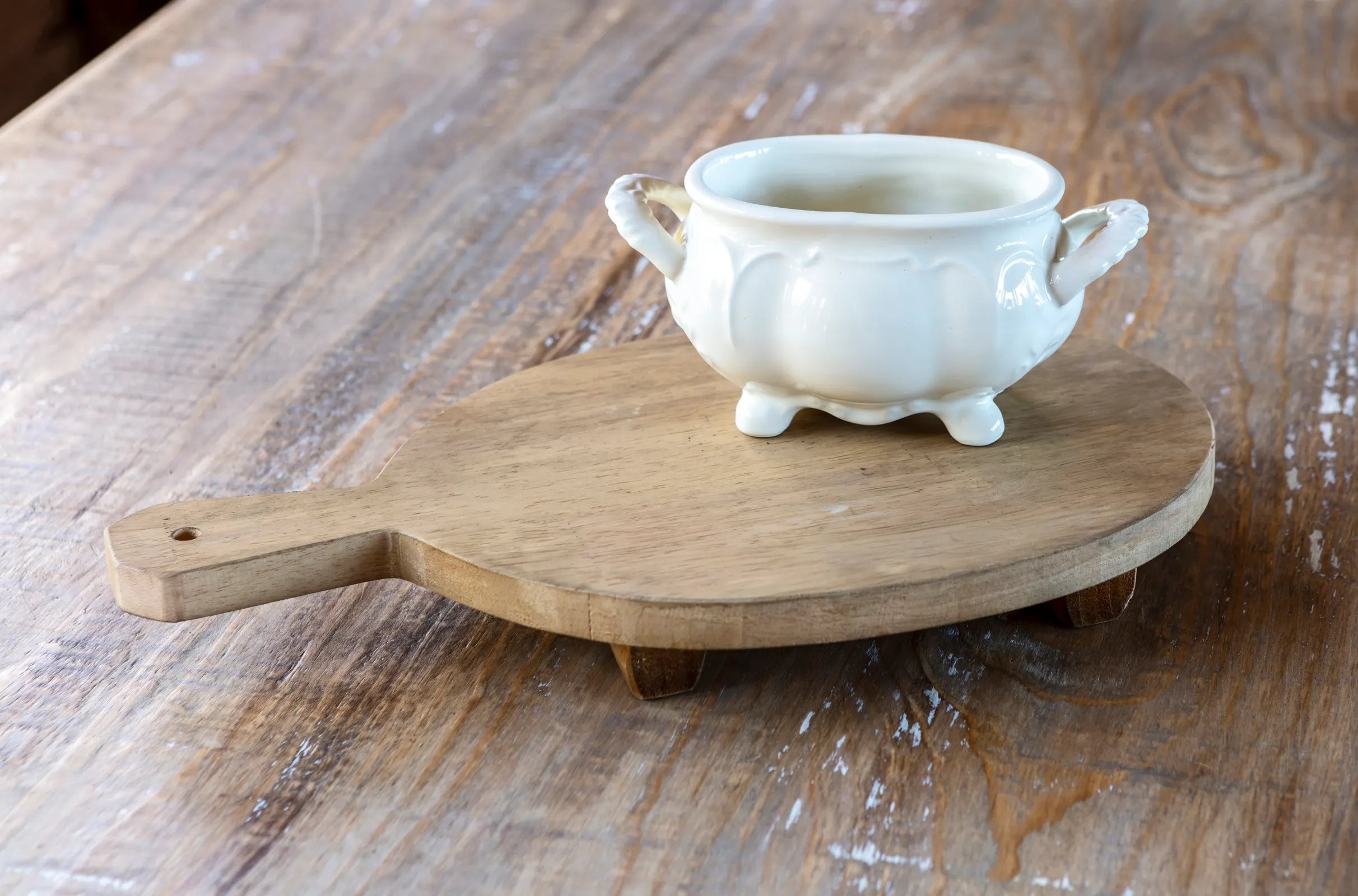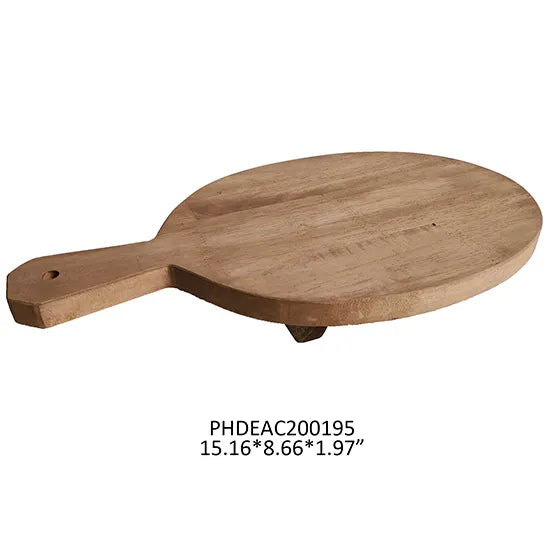 When serving we recommend our reclaimed wood round low riser with handle to use as a trivet or to display your favorite dish.
