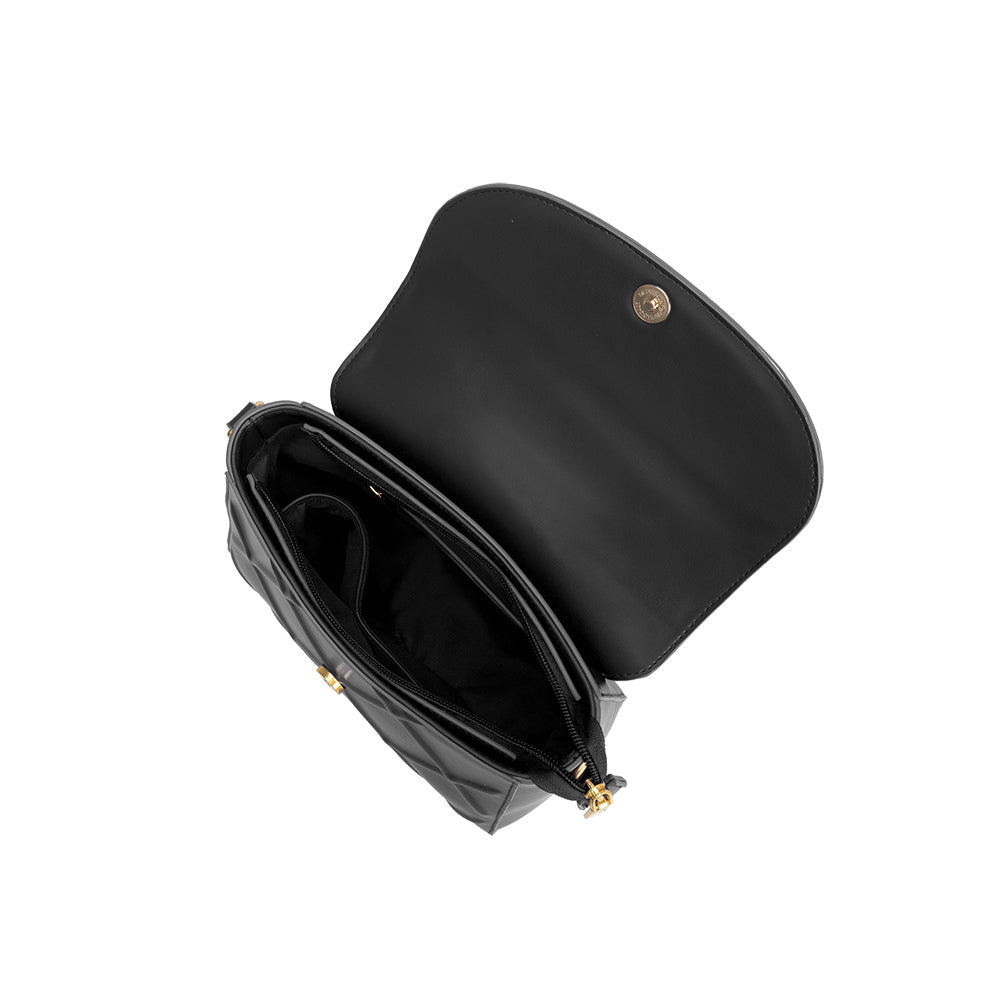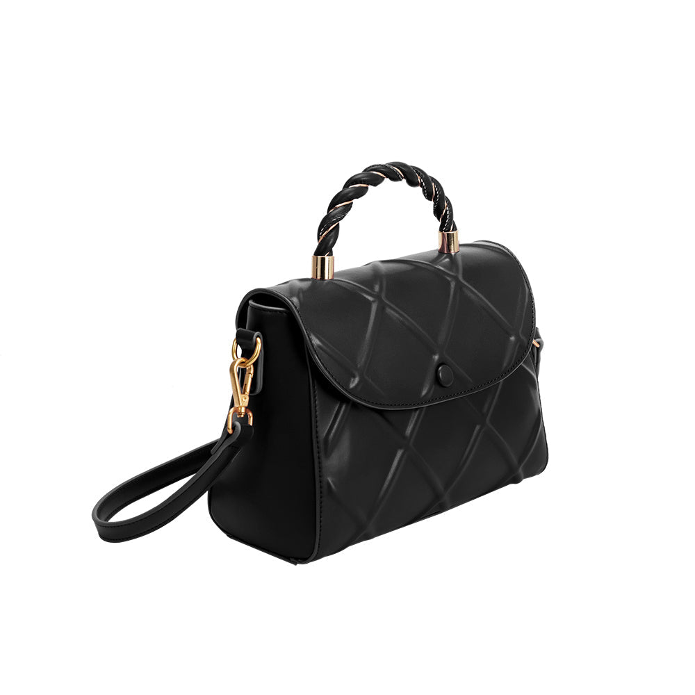 Every one of our handbags is made with quality craftsmanship and eco-friendly materials. Our Ruby is no exception, made with recycled vegan lamb leather, this top handle bag is detailed with a quilted embossed design and twisted metal handle. Includes an adjustable and detached crossbody strap.