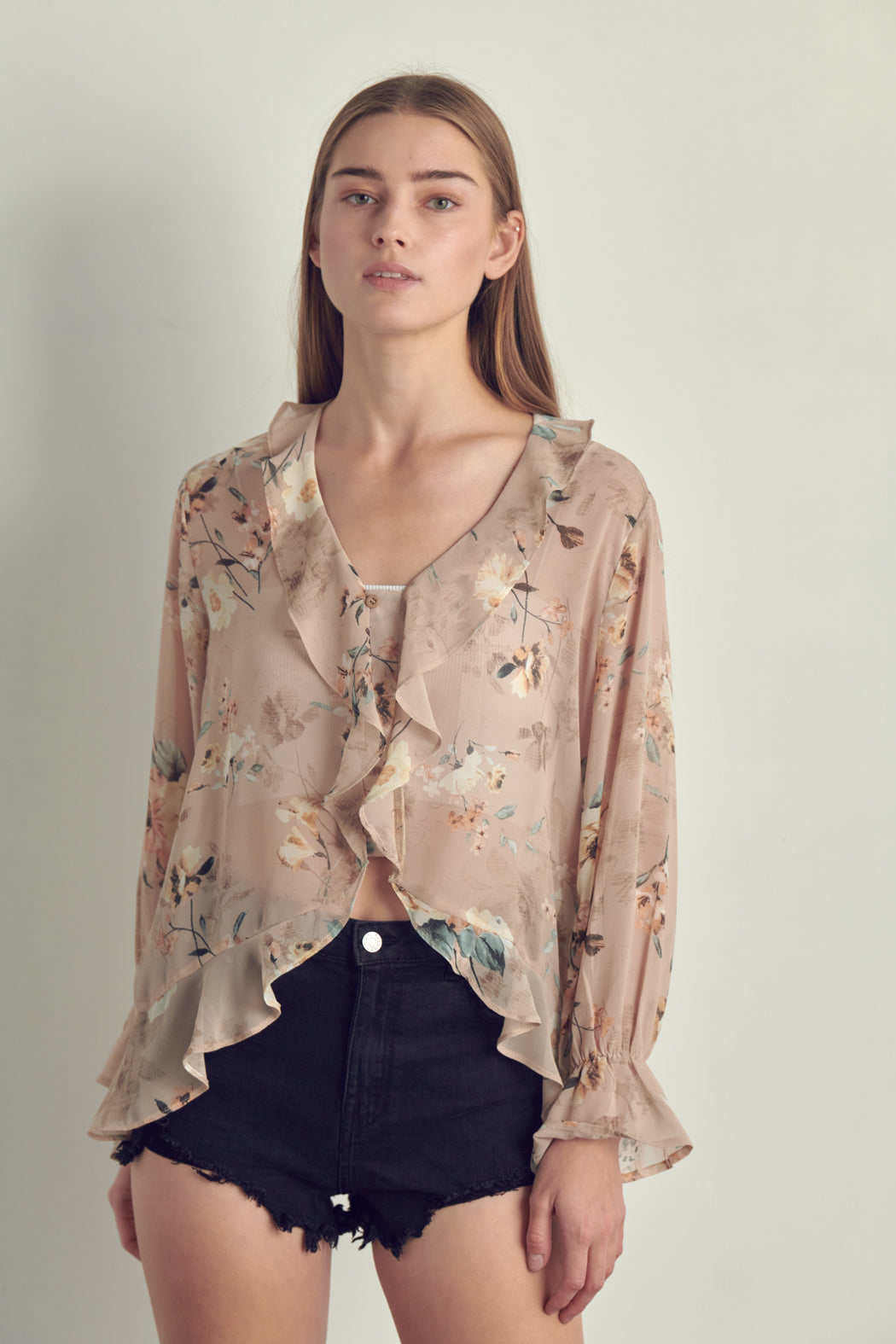 Ruffle Detail Long Sleeve In Chiffon Floral Print