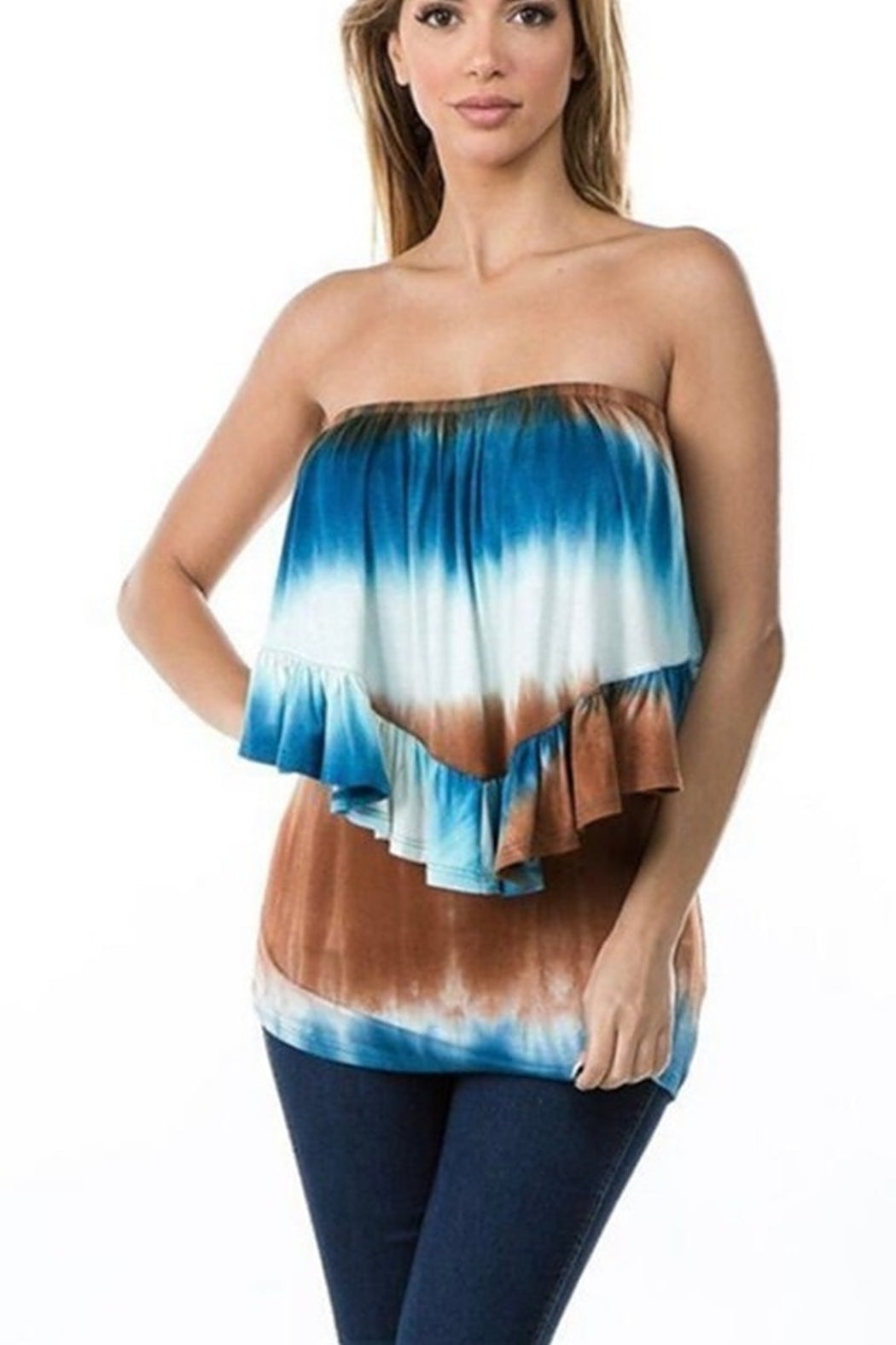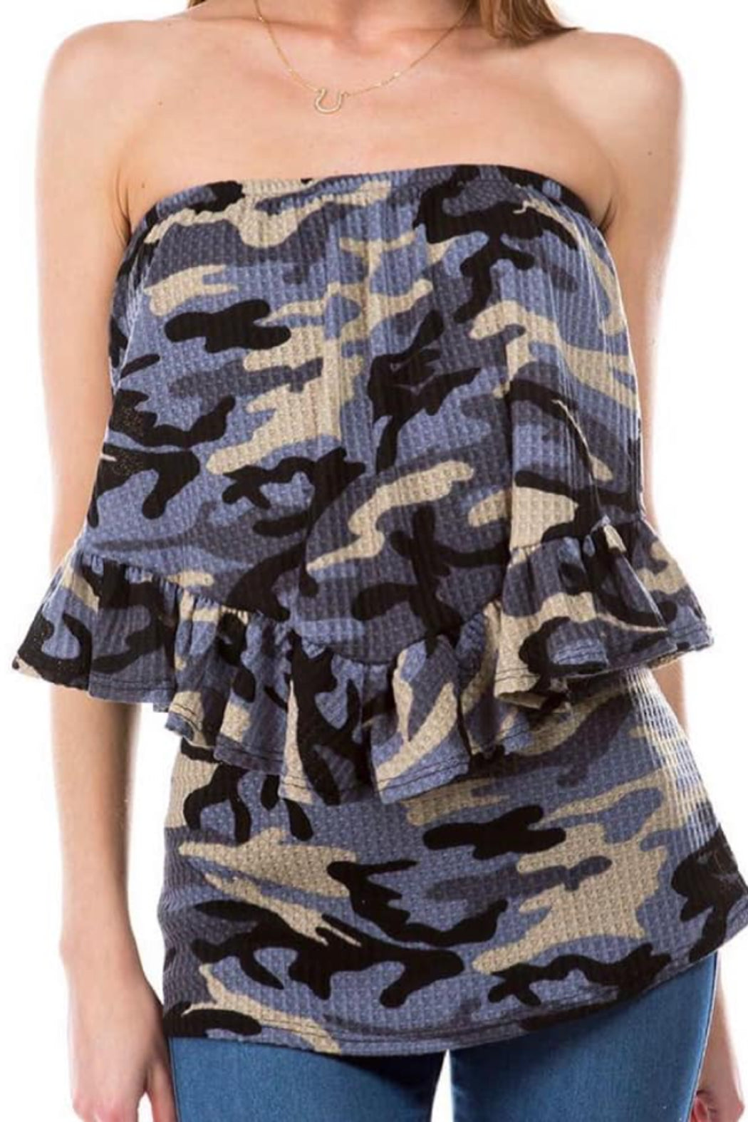 This adorable tube top has a ruffle overlay and form fitting bodice.