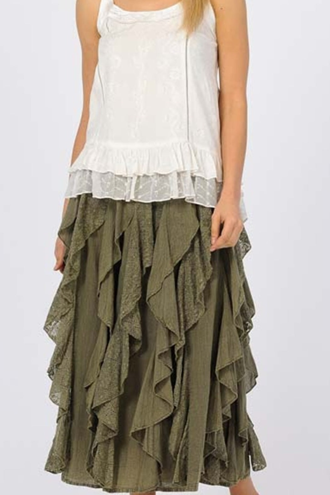 An alluring, oh so feminine skirt. Alternating ruffles of lace and solid fall gracefully to the hemline. This skirt makes an enchanting statement. Foldover waist panel measures 8" wide. Can also be worn as a strapless dress. 100% Cotton. Hand wash. Made in India.