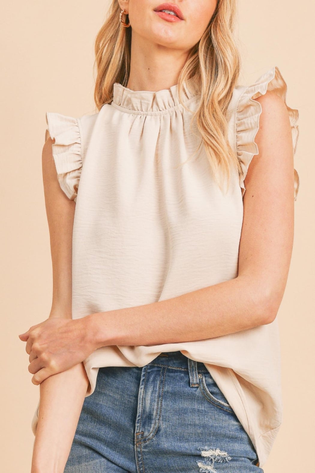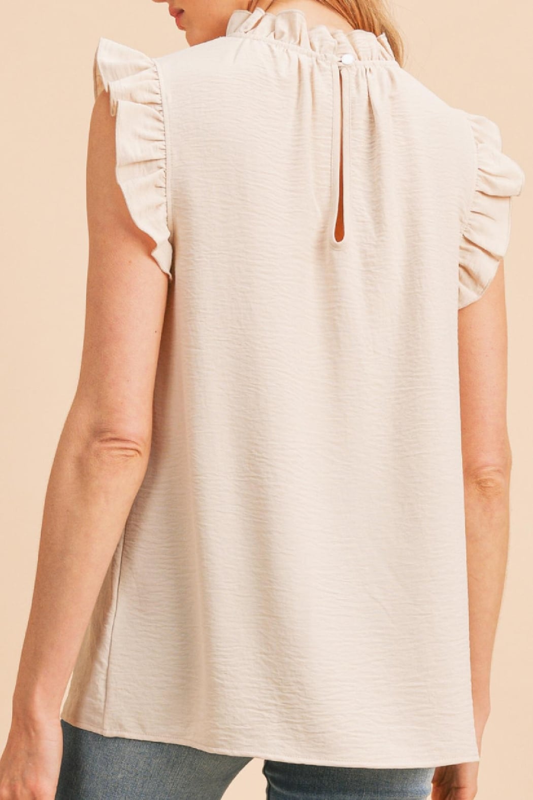 This best selling top is a solid color and woven. It features ruffled sleeves, a ruffled stand collar, and a keyhole in the back. It is comfy, yet professional for the office! Dress it up with slacks or down with denim.