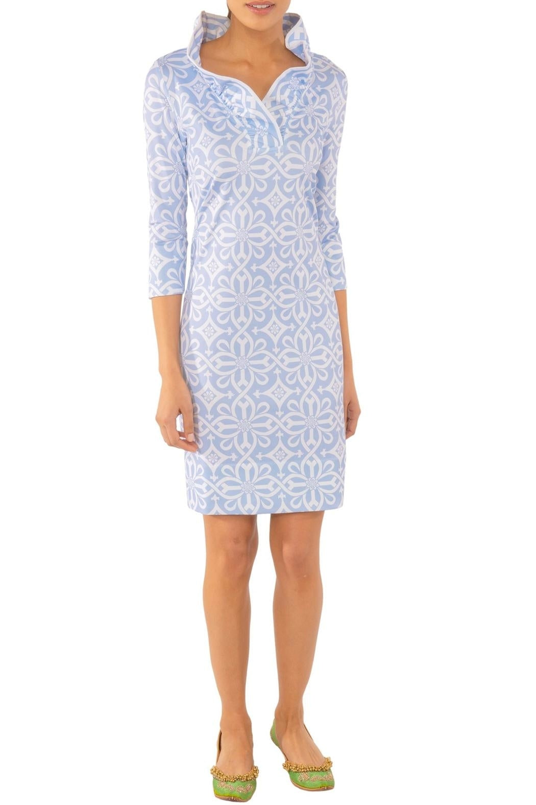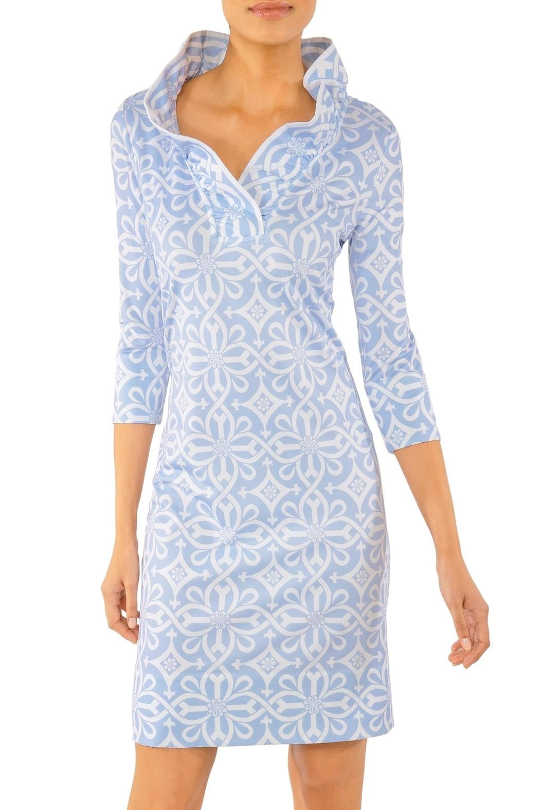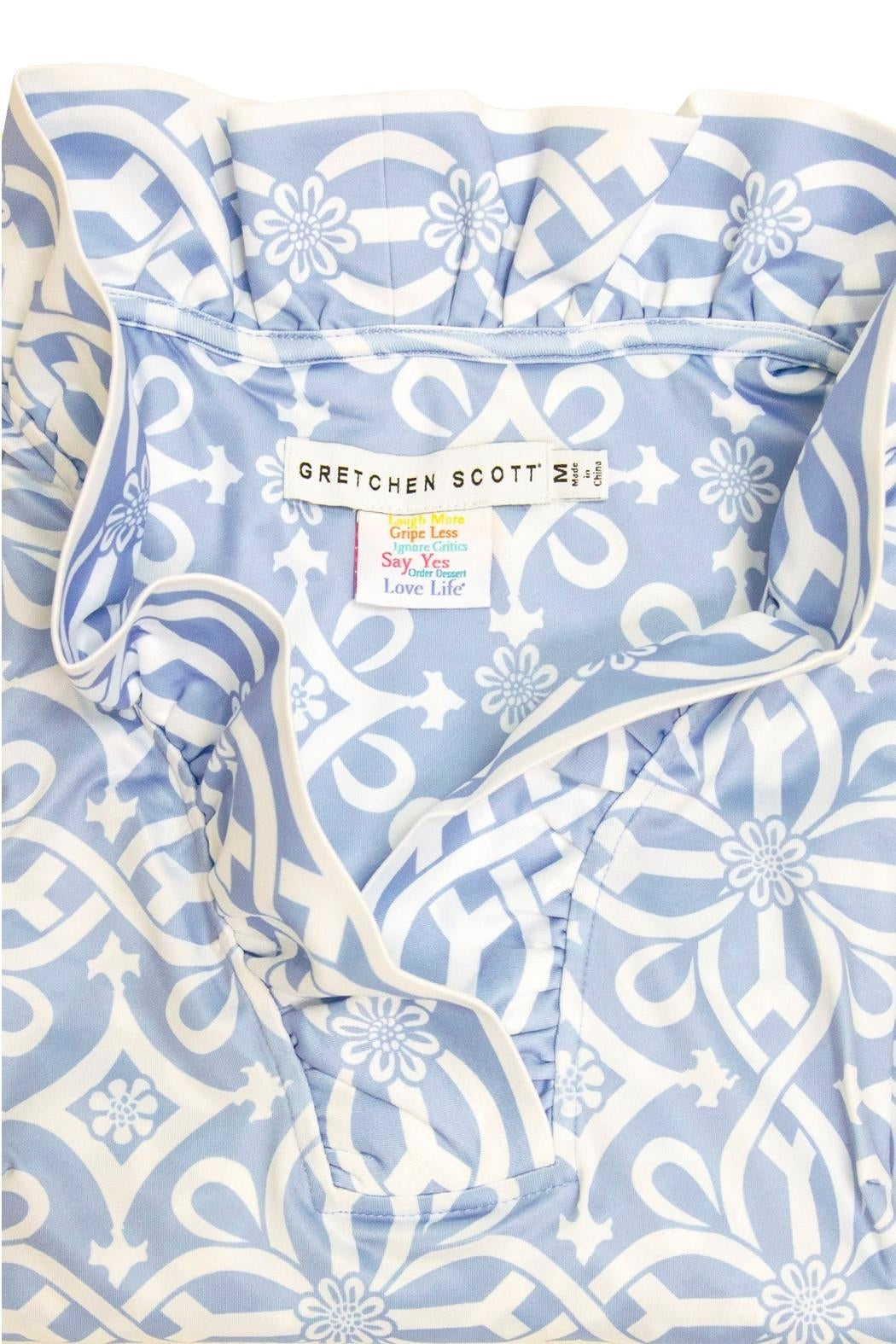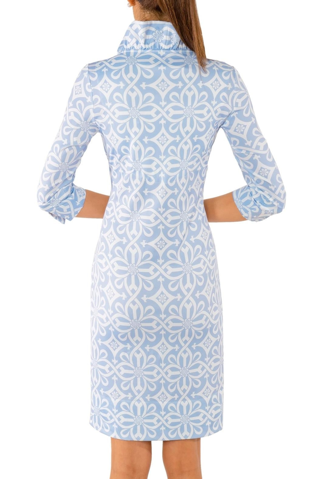 Approx. 35" Length. 3/4 Sleeves with Contrast Turn Back Cuffs. 4" Hand Hem. Stand Up Ruffle Neck. Contrast Print Detailing. Inside Contrast Back Panel.
