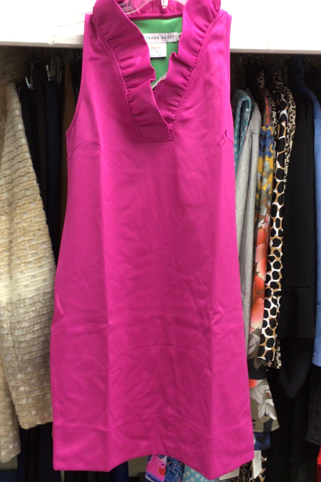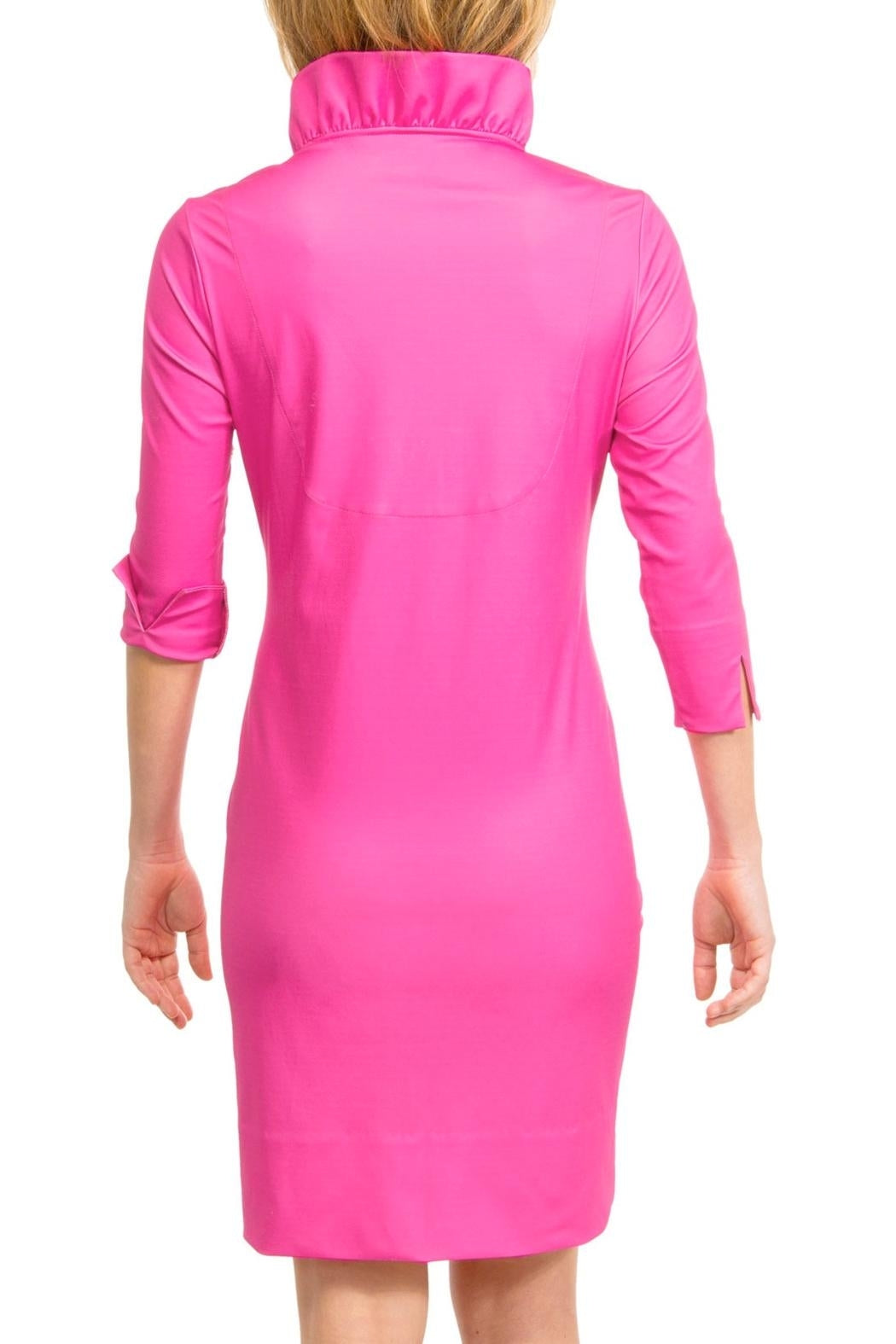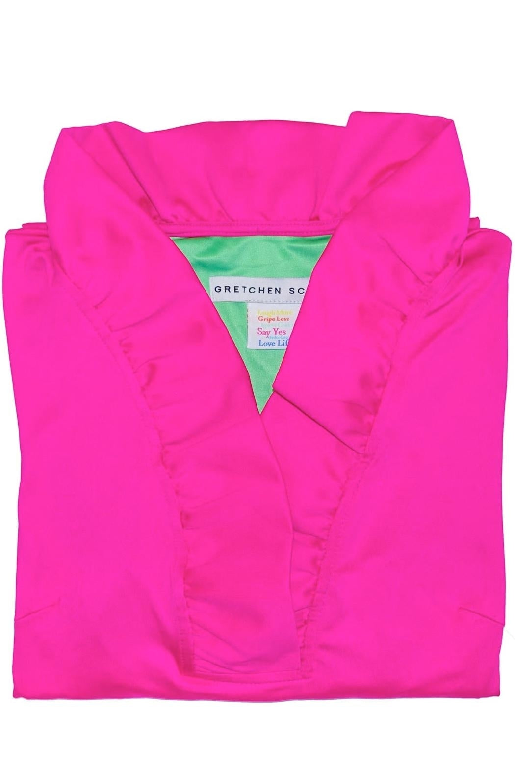 Approx. 35" Length. 3/4 Sleeves with Turn Back Cuffs. 4" Hand Hem. Stand Up Ruffle Neck. Inside Contrast Back Panel. Fabric Care: 97% Polyester / 3% Elastane. Machine Wash Cold / Cool Tumble Dry or Dry Clean.