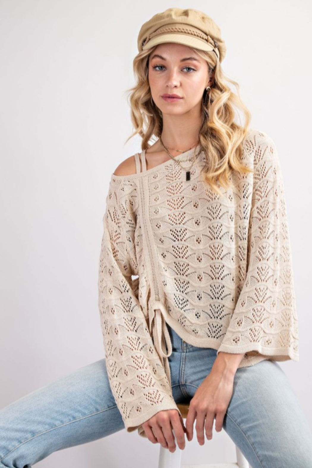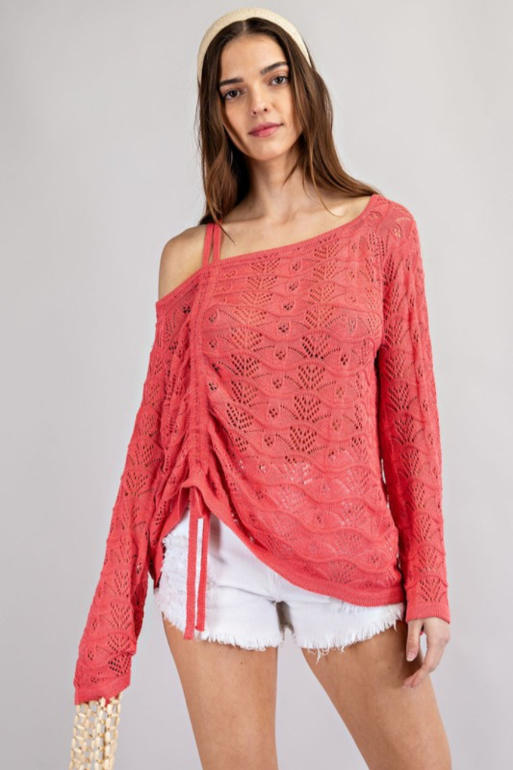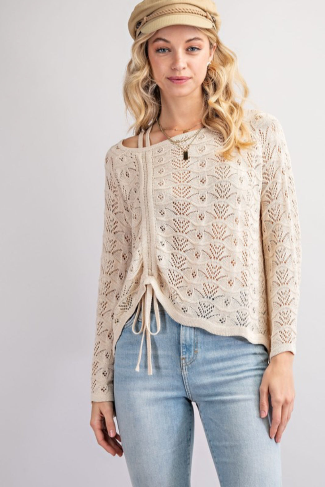 This long sleeve sweater features an open knit pattern and a boat neck with strappy rushed detail. This top can be dressed up or down and looks great with denim jeans.