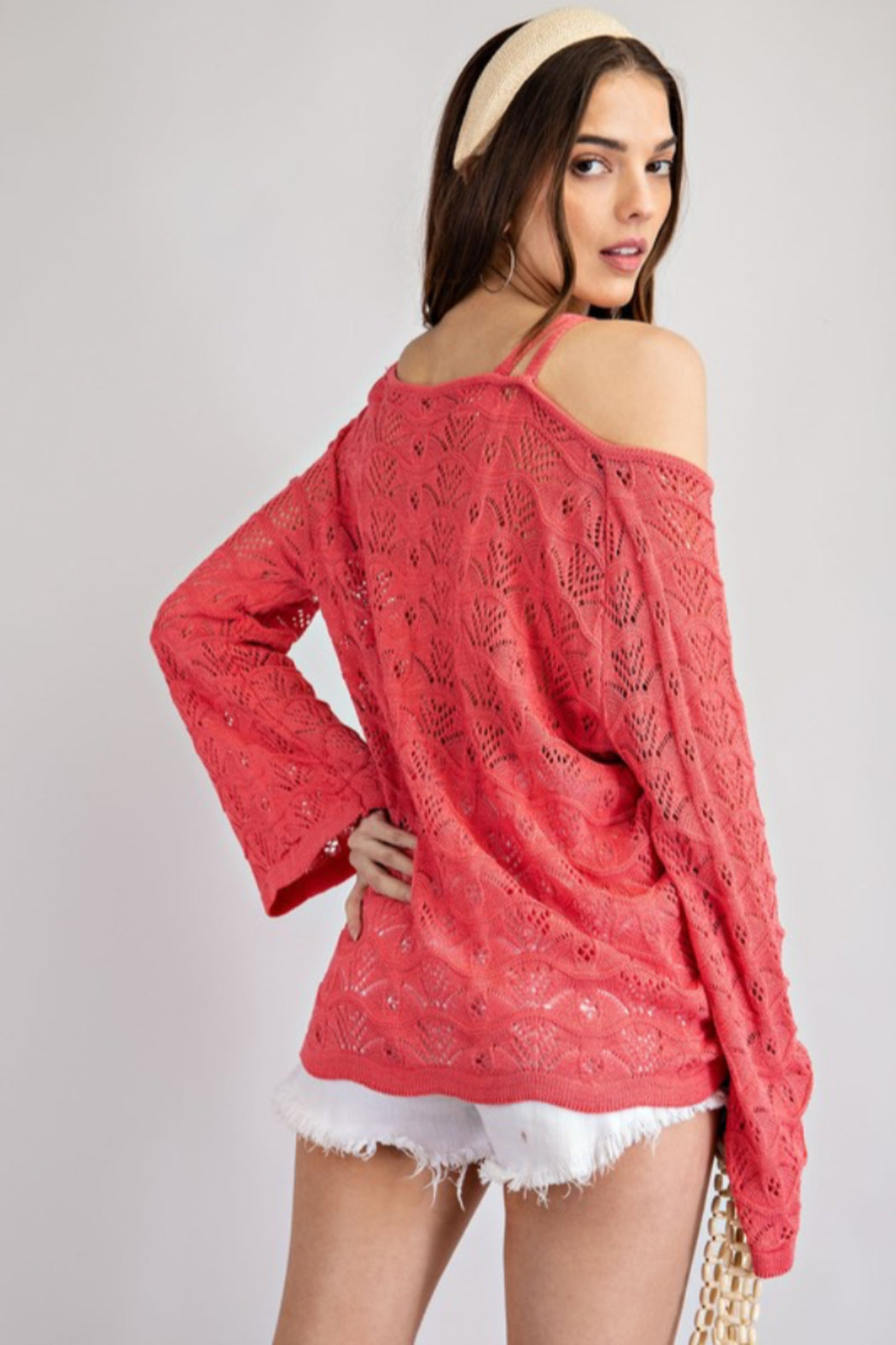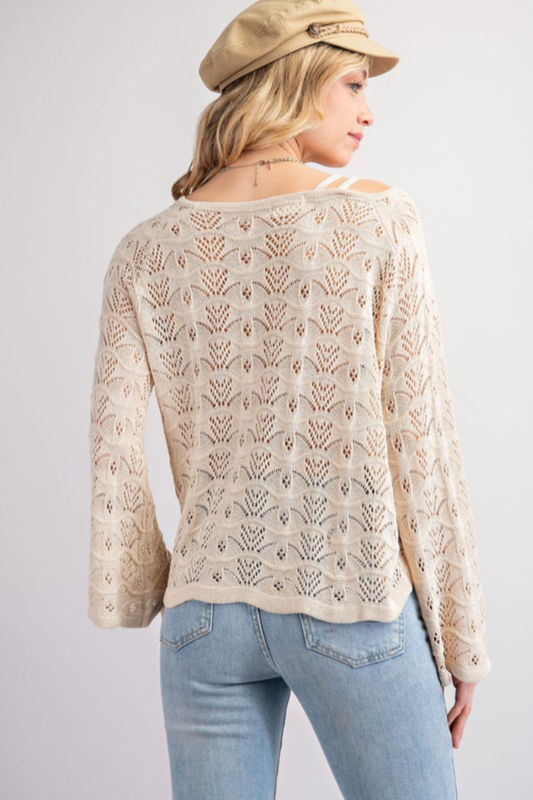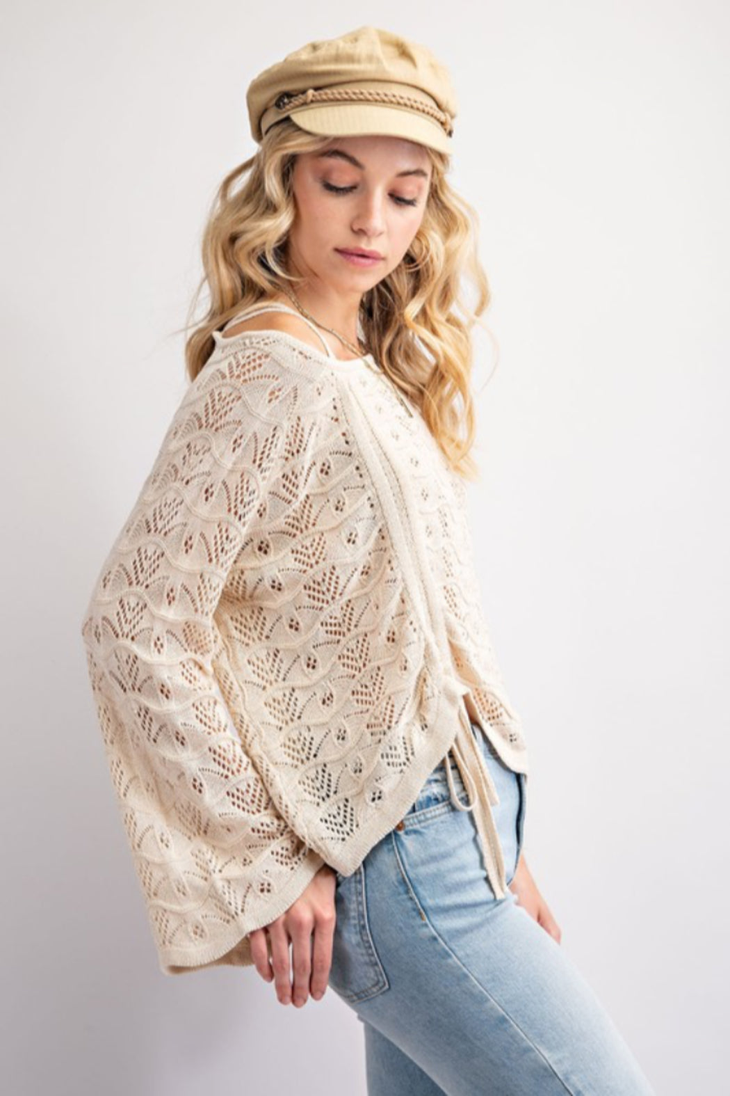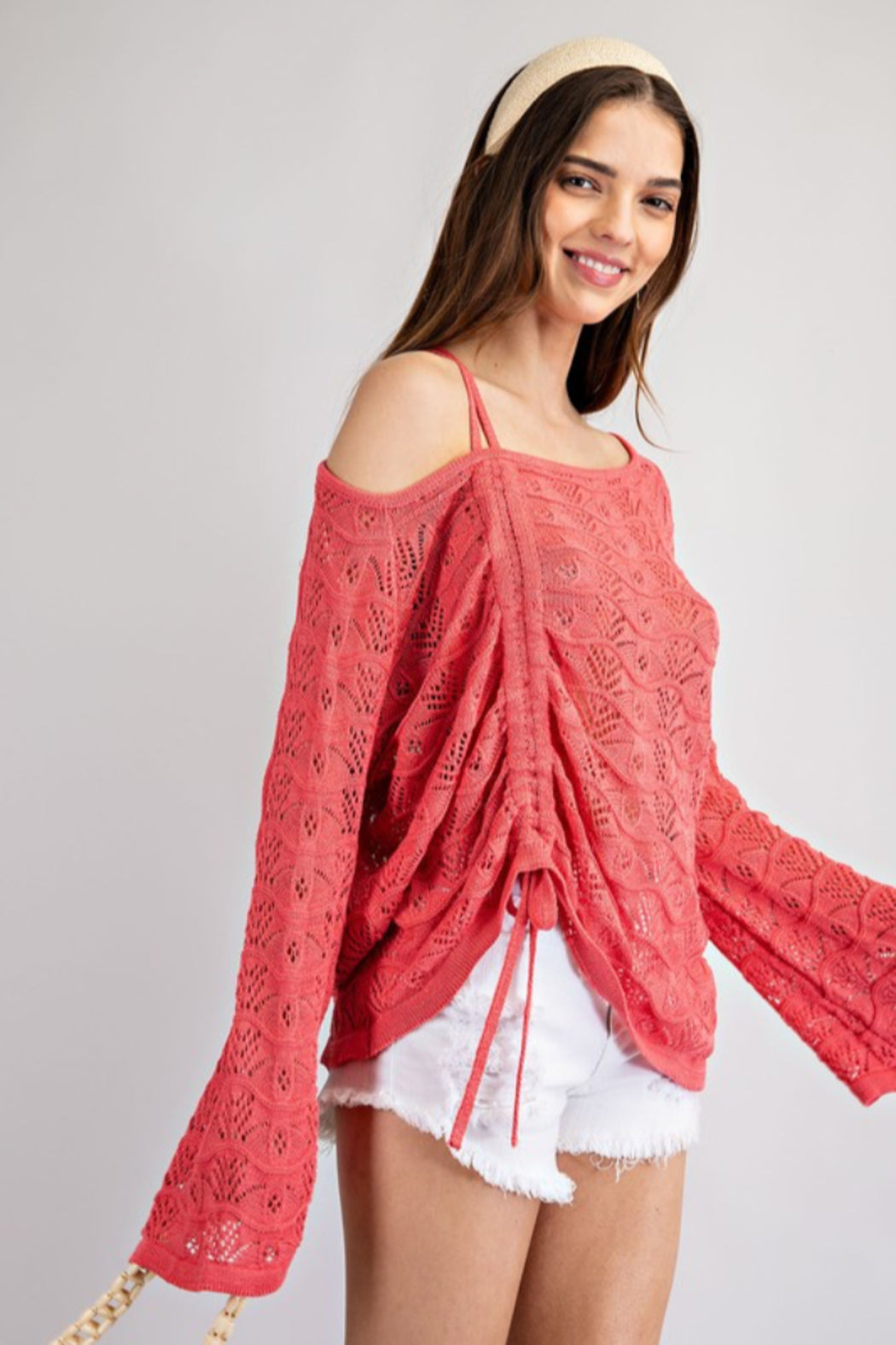 This long sleeve sweater features an open knit pattern and a boat neck with strappy rushed detail. This top can be dressed up or down and looks great with denim jeans.