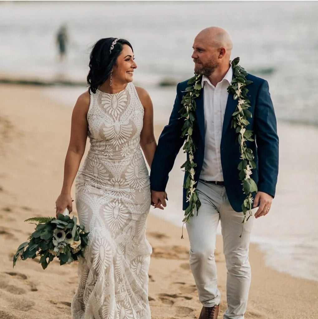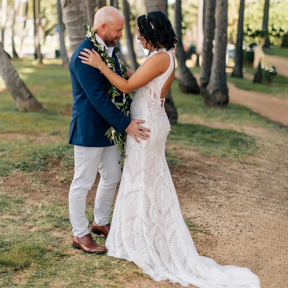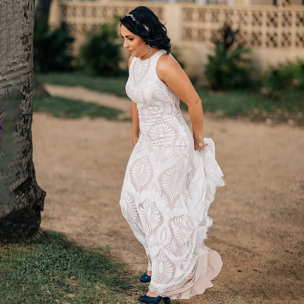 Boho Open Back Halter Lace Sleeveless Low Cut Buttons Mermaid Trumpet Bridal Gown