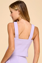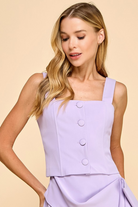 A stylish square neckline top featuring dome-shaped buttons and wide straps for a chic and modern look. Matching skort sold separately.