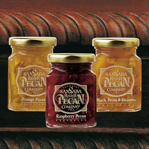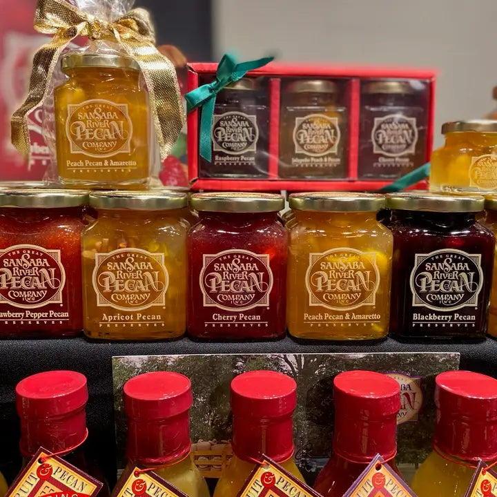 Twelve unforgettable flavors from our orchard kitchen.. All Handmade in small batches in our orchard kitchen. The logo is fired in the jar so that the beauty of the large chunks of fruit and pecans is visible. Suggested uses and nutritional information is included in a fold out on the bottom of each jar.