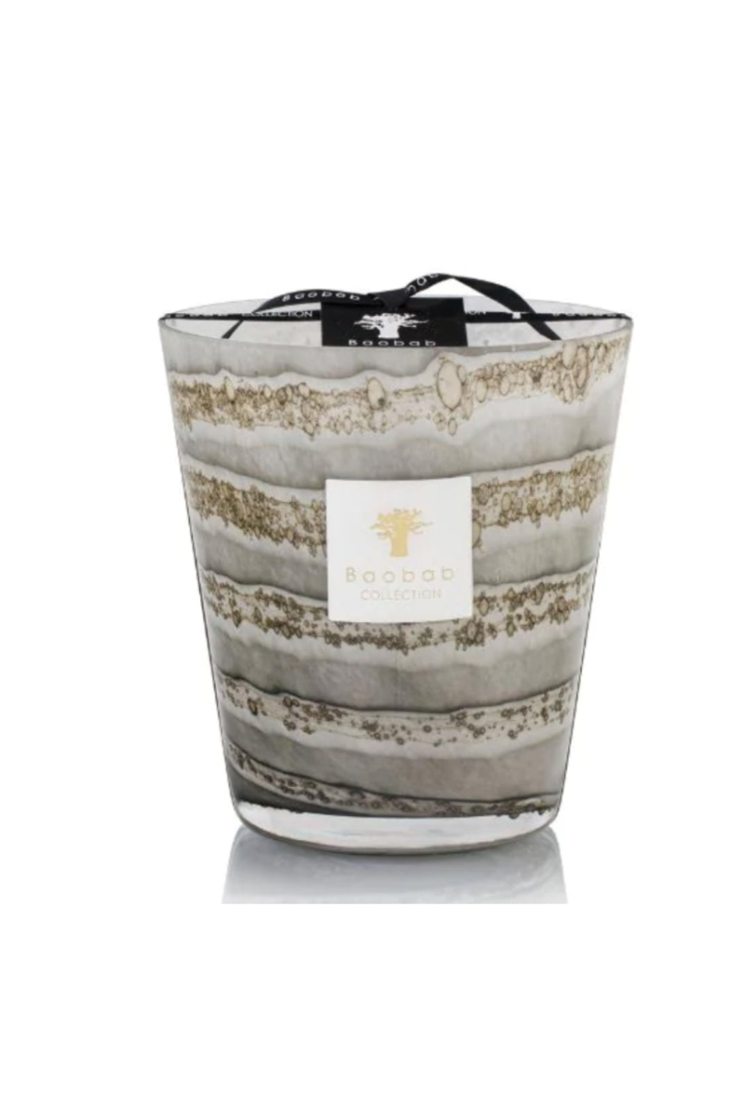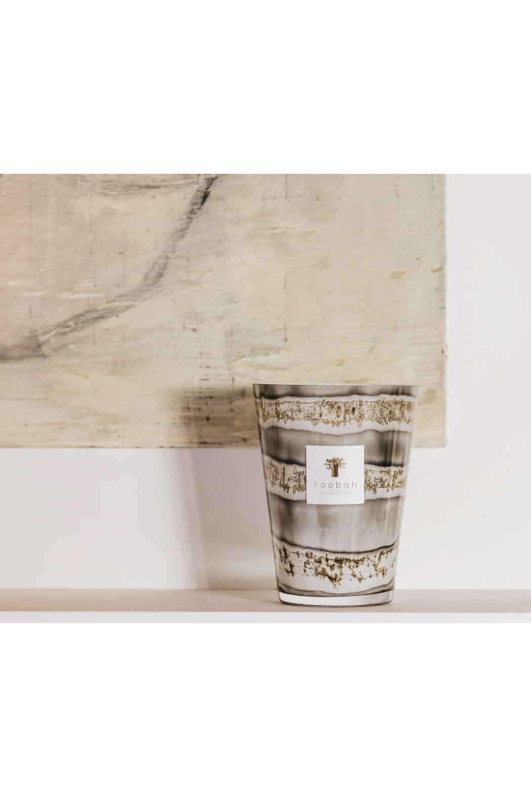 A hand-blown glass with subtle shades of gray was made by our glass artisans. Horizontal strata form gray stripes dotted with small round and organic shards. The Atacama scented candles are refined objects perfect for urban and chic interiors.
