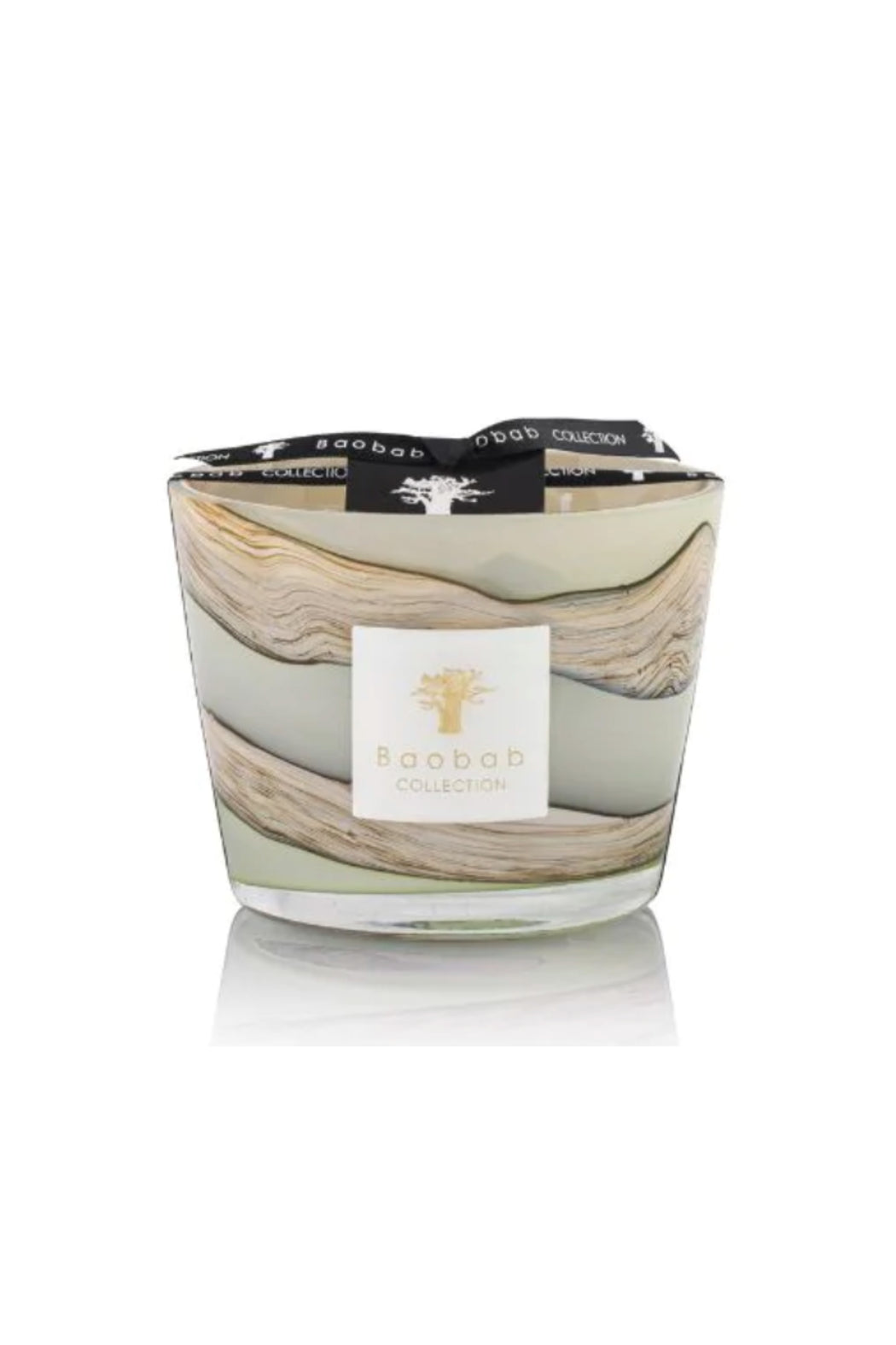 The Sonora scented candle is embodied in a highly sophisticated hand-blown glass. The colors that form random lines on the glass are an explosion of refined tones ranging from celadon green to blue-gray shades.