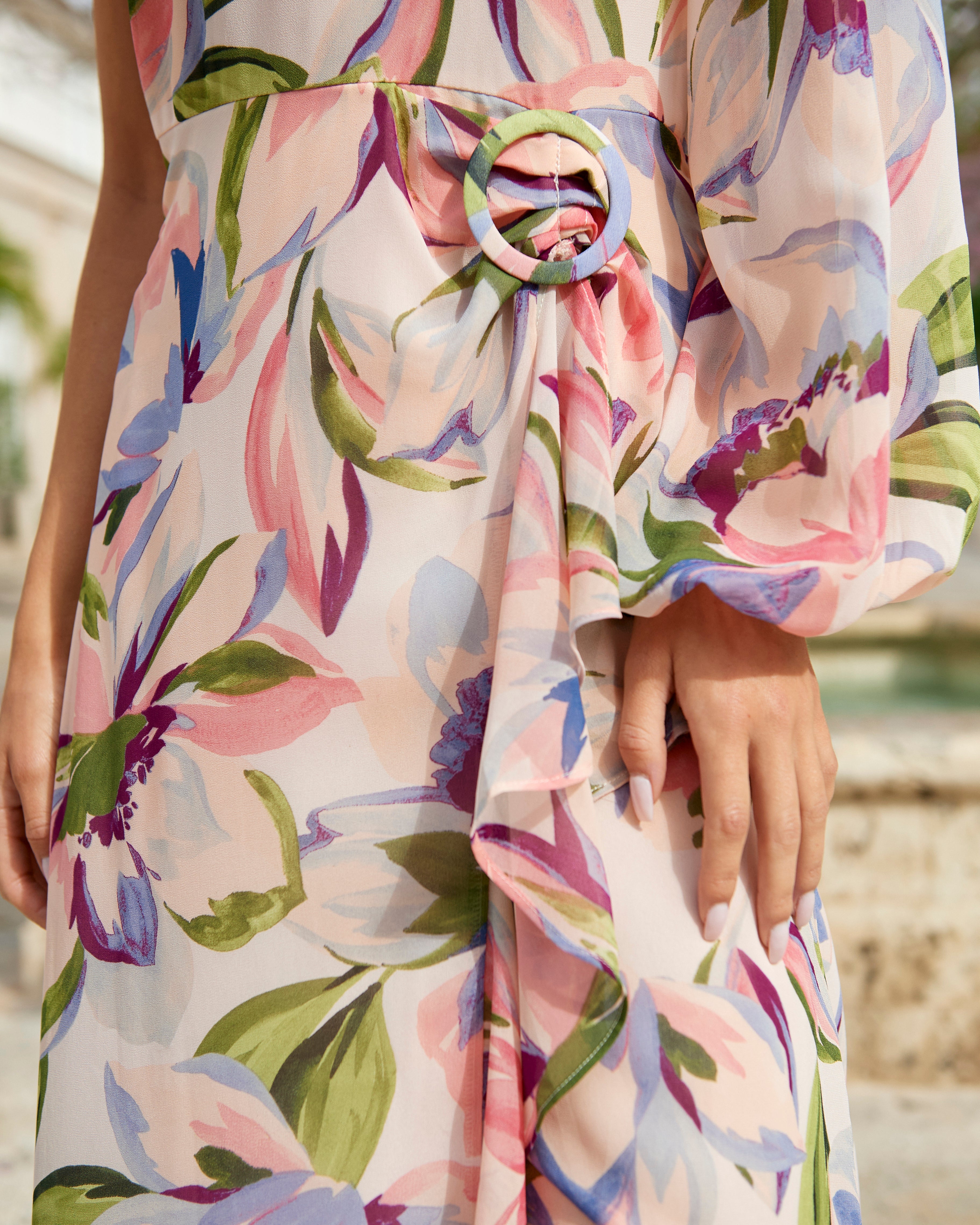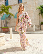 Let your floral fantasies come to life in our Sandersonia One Shoulder Dress. This romantic and cute dress features a maxi length chiffon design with a playful balloon sleeve. The elasticized cuff and attached decorative belt add a touch of elegance, while the ruffle front trim and leg slit bring a flirty edge. Perfect for spring weddings or any romantic occasion.