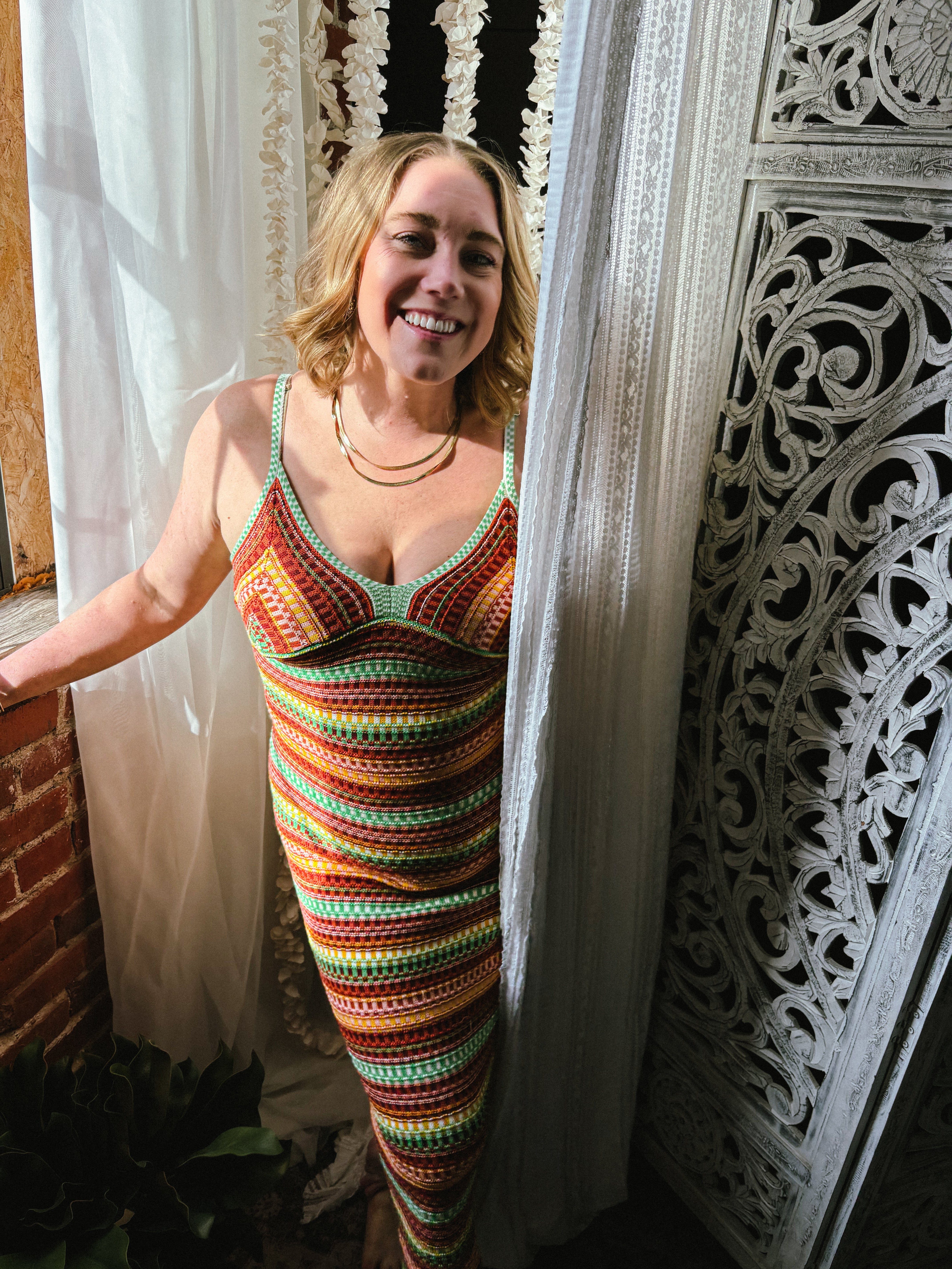 Sandy Striped Knit V-neck Halter Crochet Midi Dress