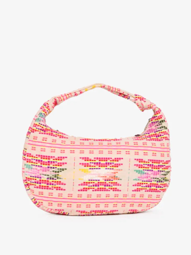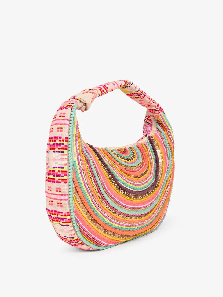 Embellished handbag, Vibrant boho hues of coral, pink, teal and purple.