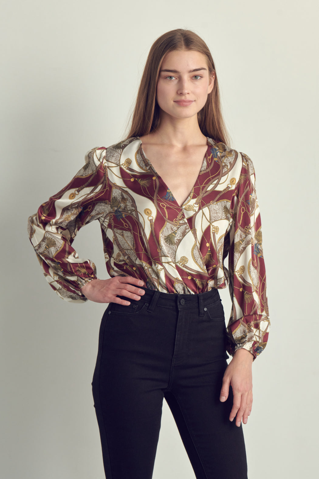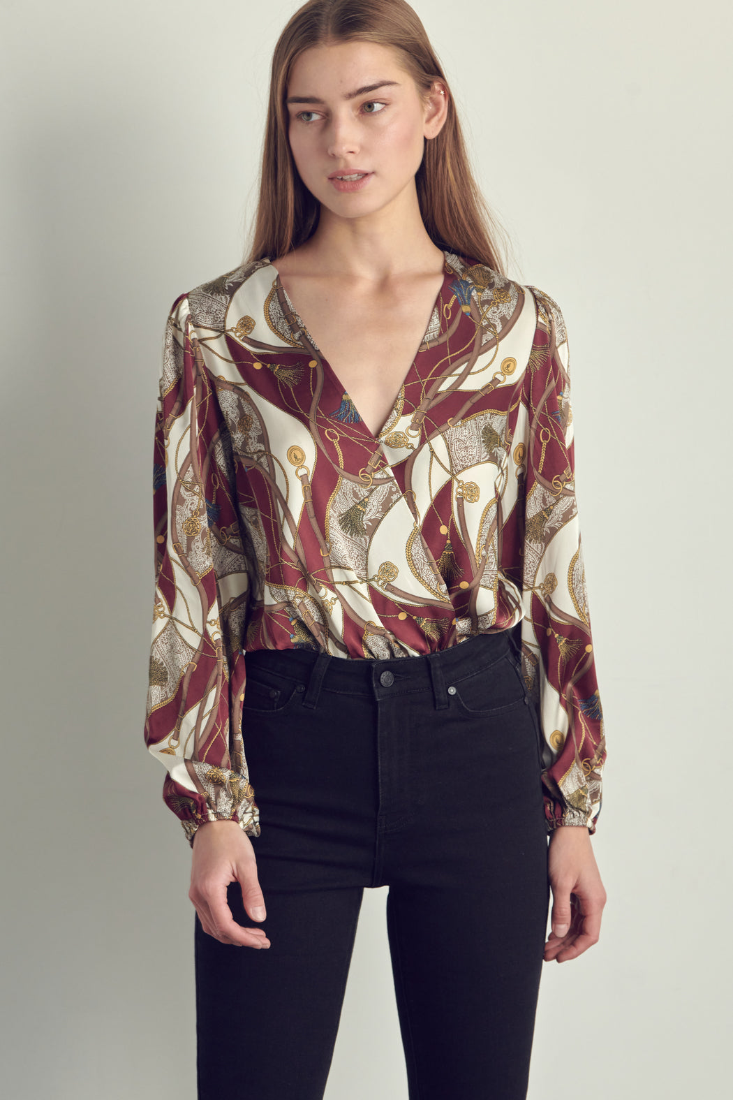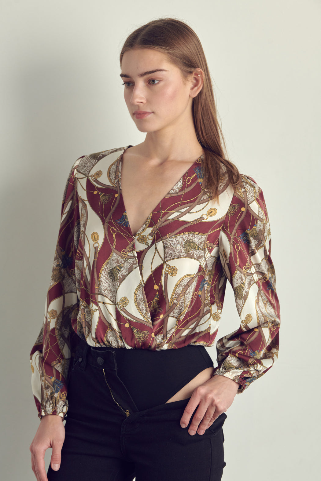 The bodysuit has a surplice neckline.