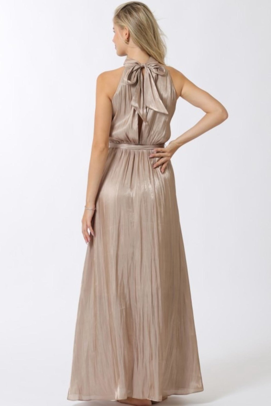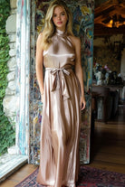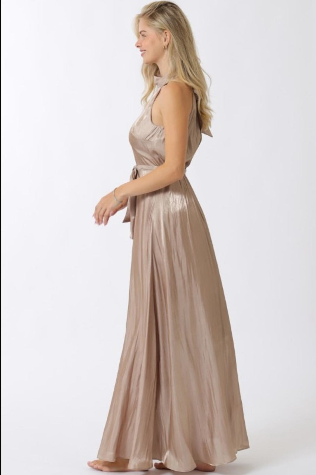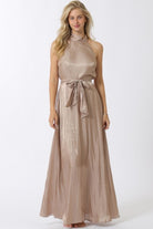 Satin high neck maxi dress with sash belt. Model is wearing a size Small