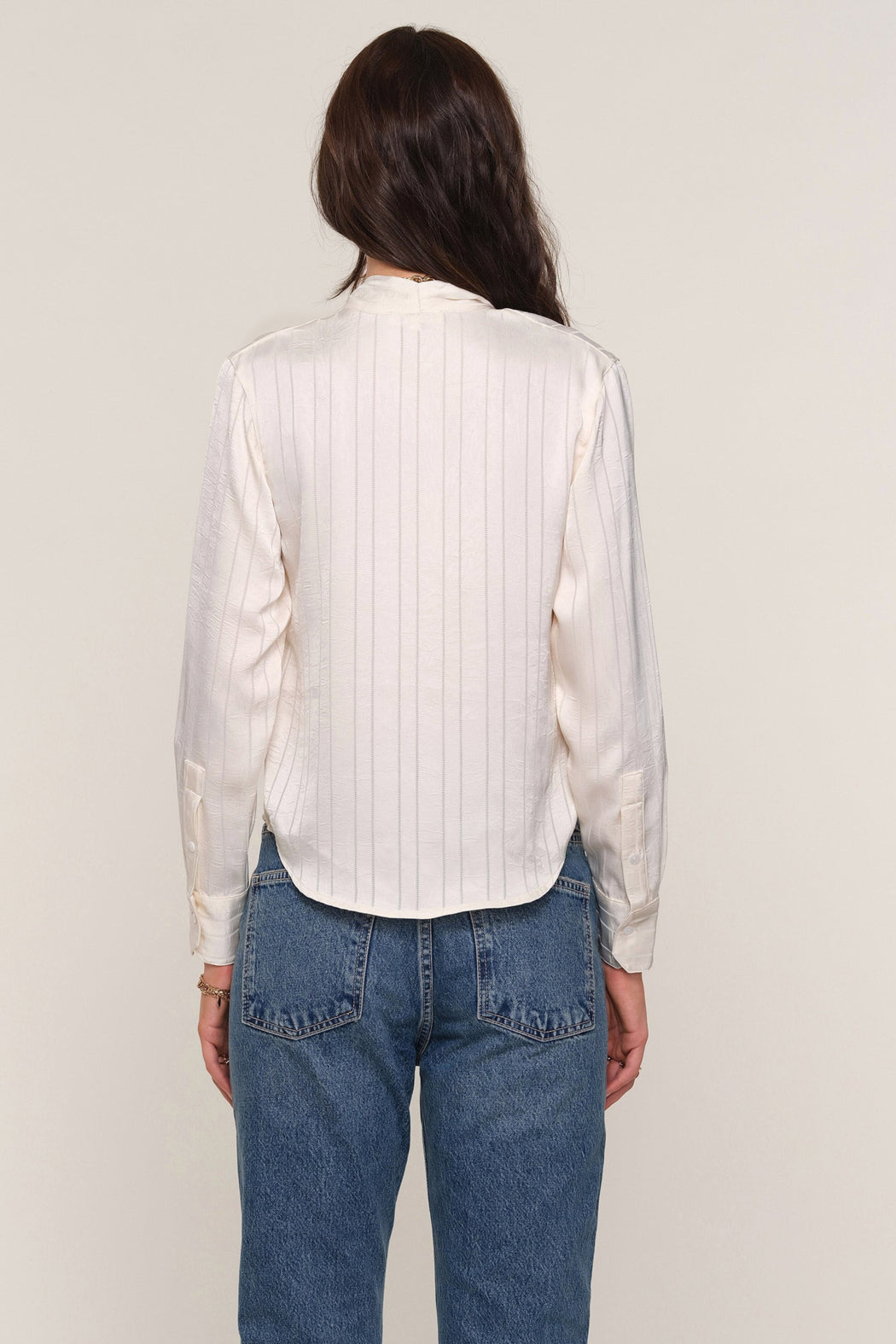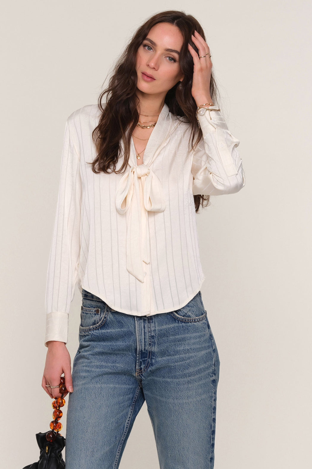 The Sawyer Top is a striped, satin shirt with a relaxed fit. It features a v-neck with a self tie. Tuck it into your favorite jeans and pair with a boot.