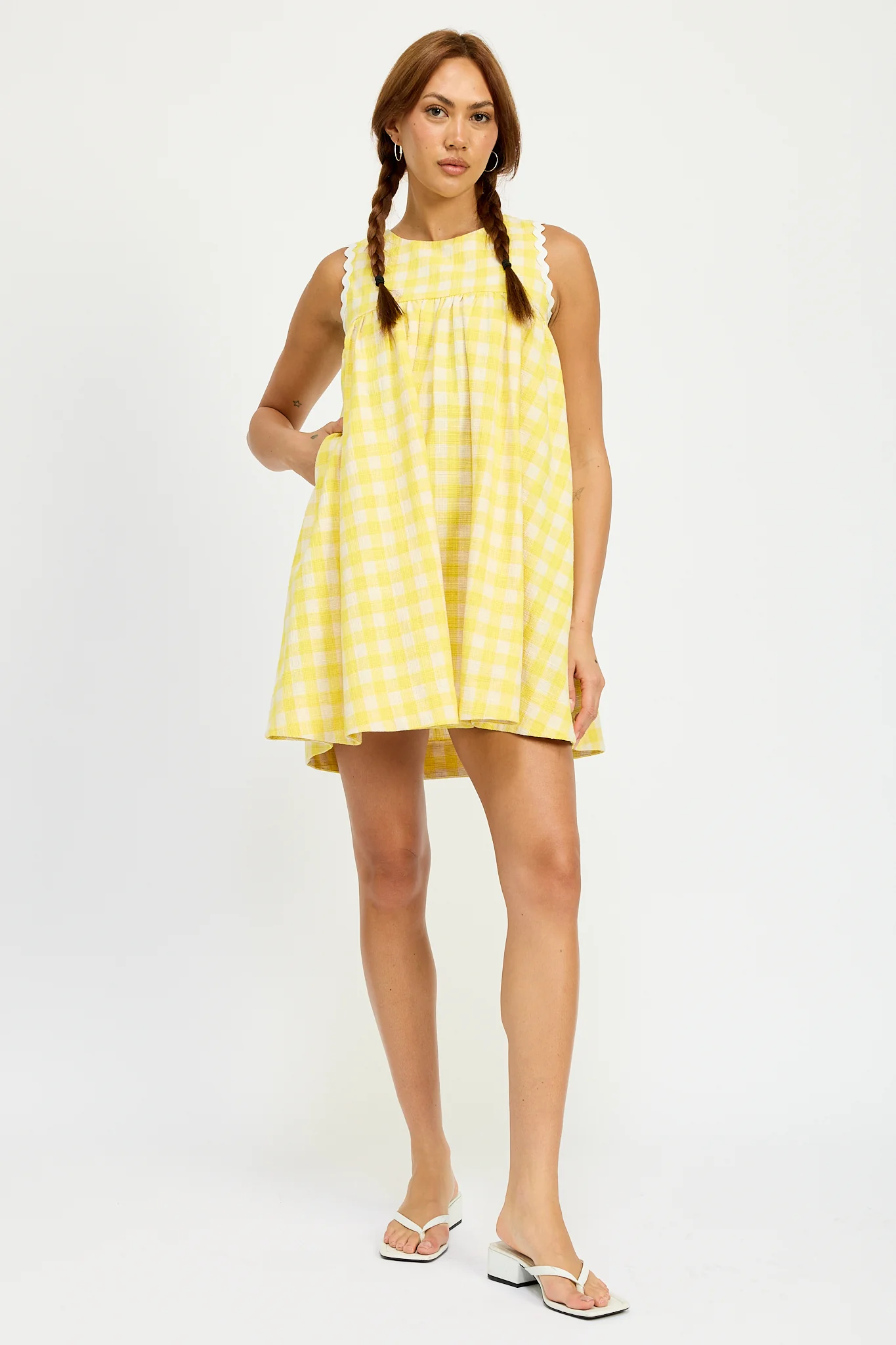 Lemon gingham minidress with scalloped edges around armholes. Fully lined and pockets.