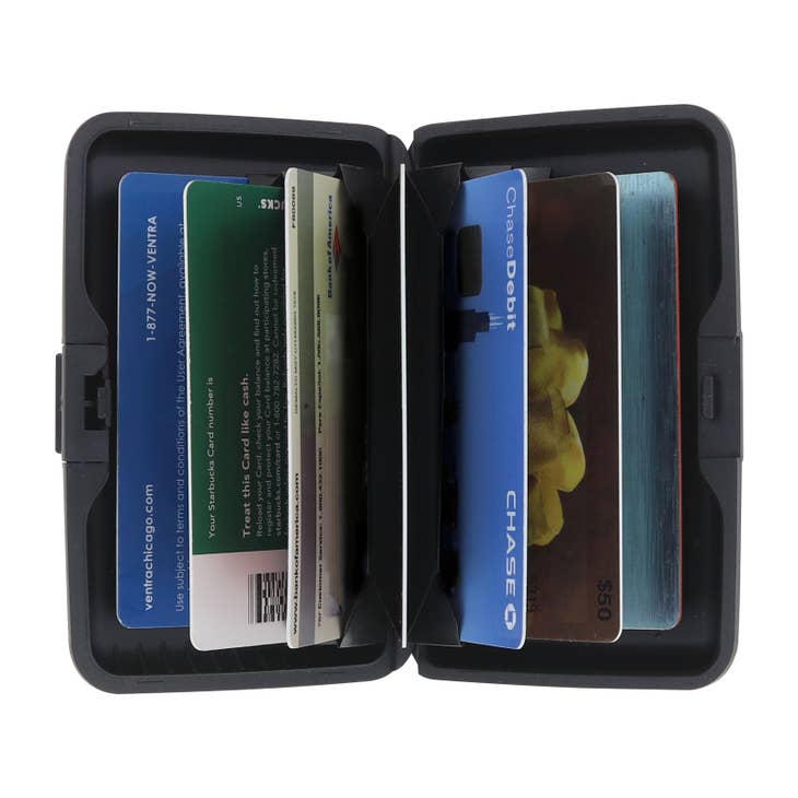 The ScanSafe Security Wallet features seven accordion-style slots in water-resistant hard shell casing with snap closure. Durable aluminum alloy is infused with certified RFID technology to guard against identity theft.