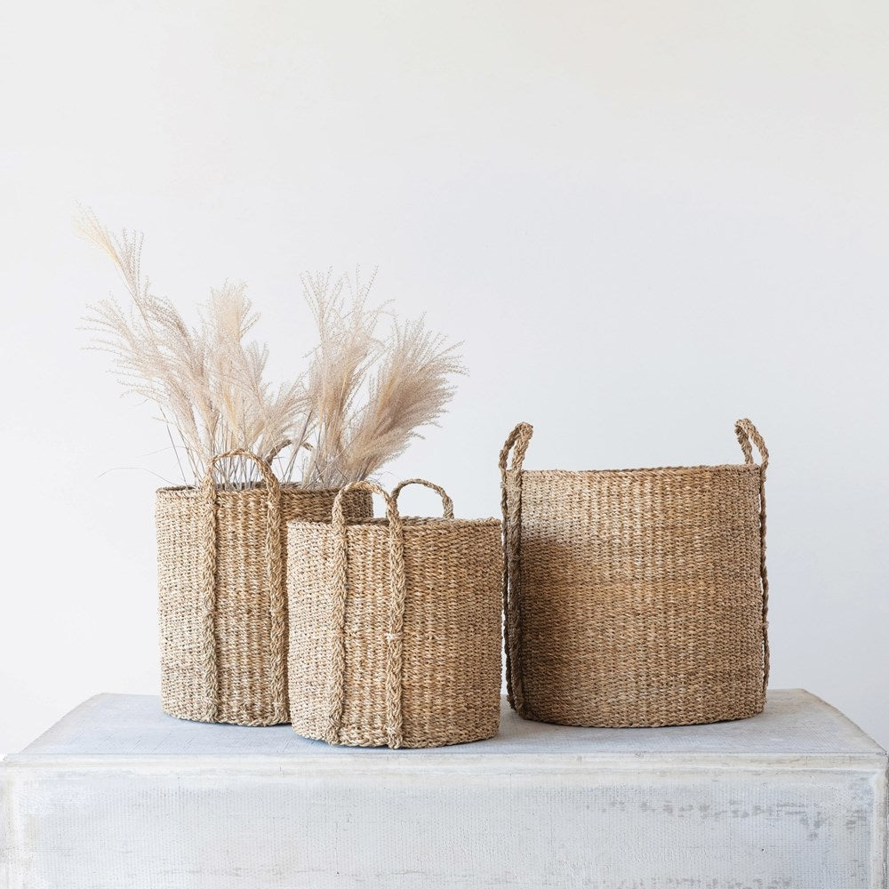 These baskets are woven from seagrass, and they feature braided seagrass handles that run up and back down on either side of the baskets. Even the smallest basket is large enough to hold a magazine collection, cozy blankets, or even your favorite floral arrangement.