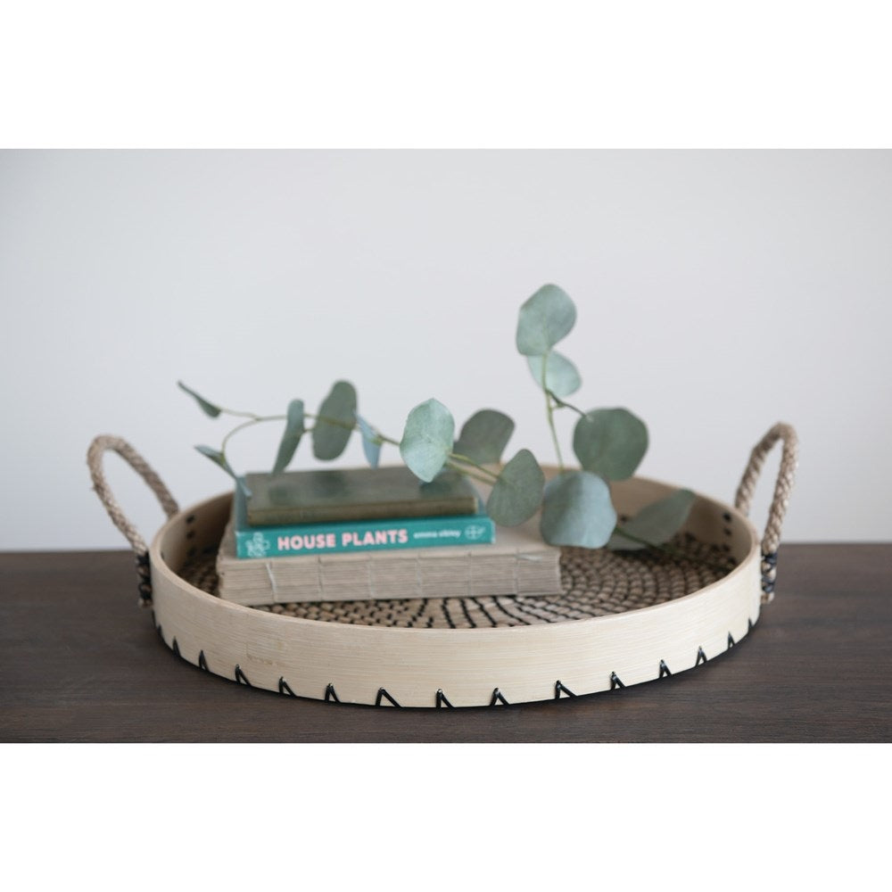 This tray is woven with rope and seagrass and measures 17.75" in diameter.