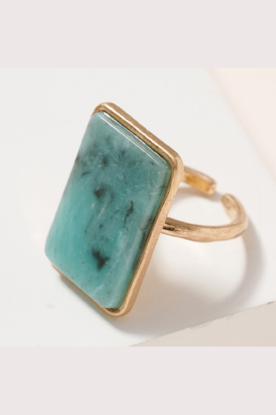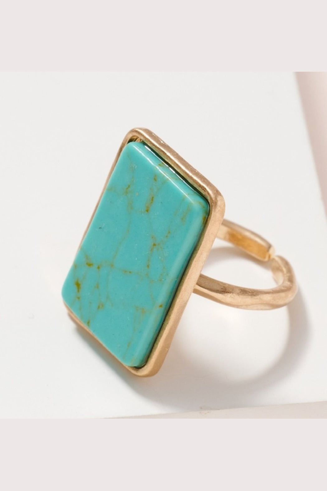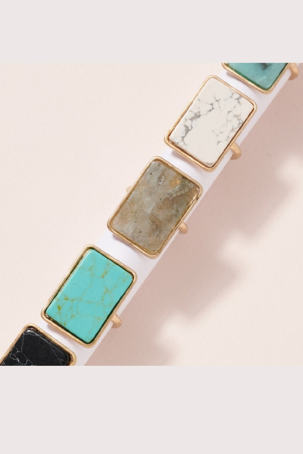 We love every color of this open ring with rectangular shaped semi precious stones. Such a fun statement piece!