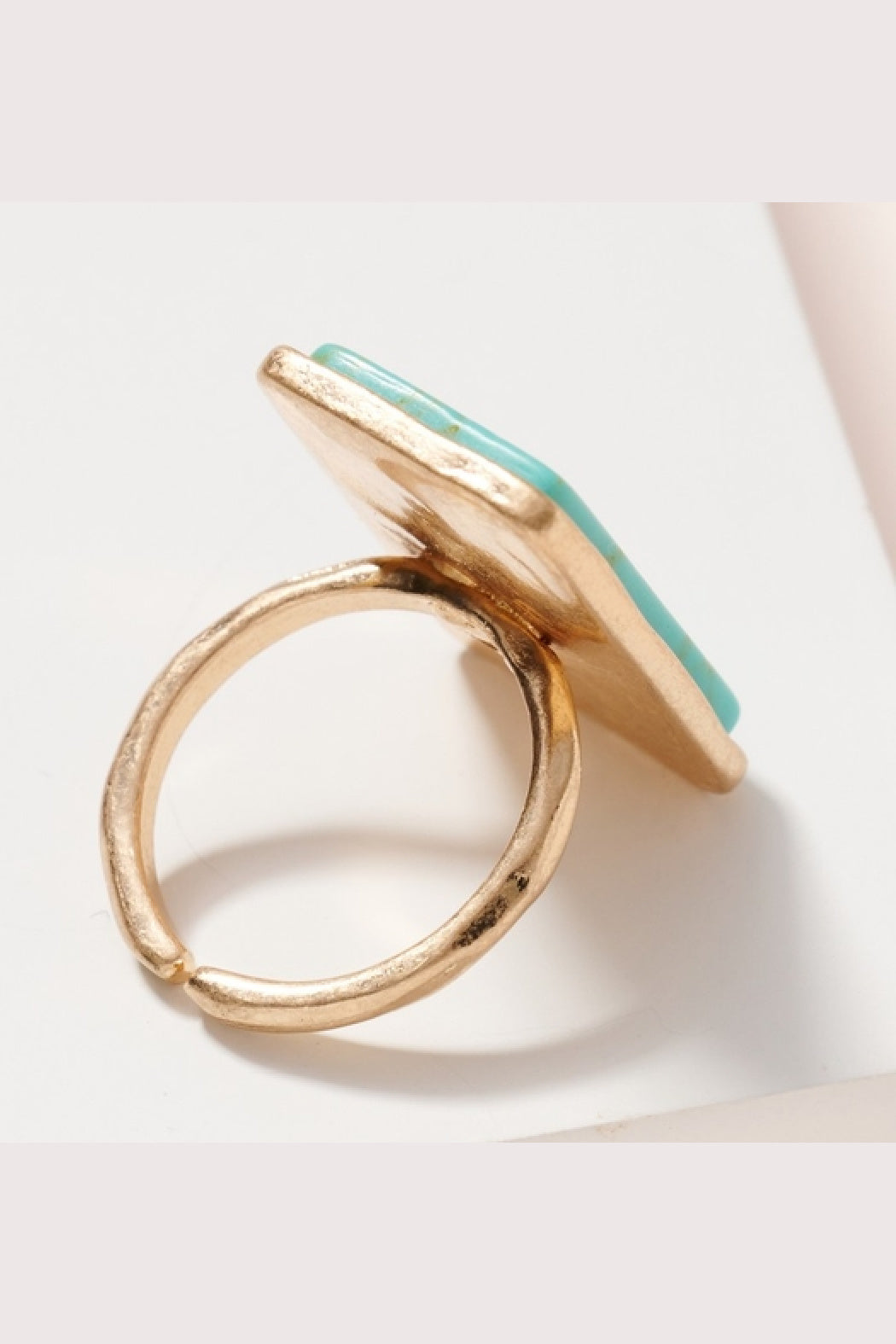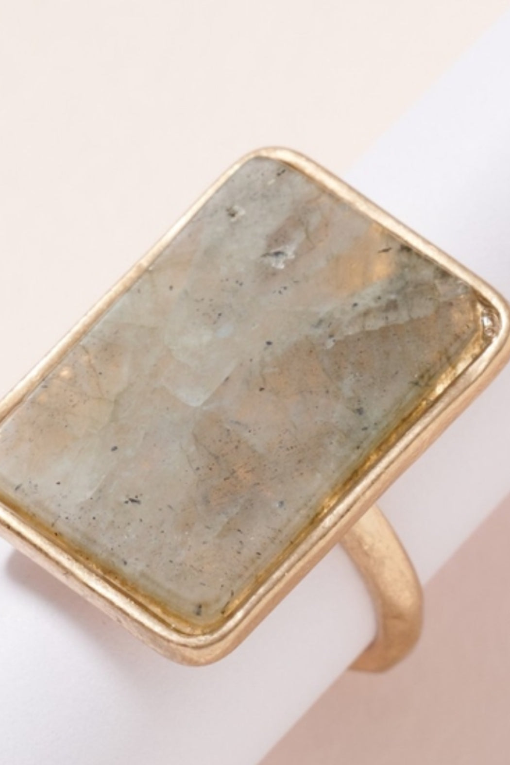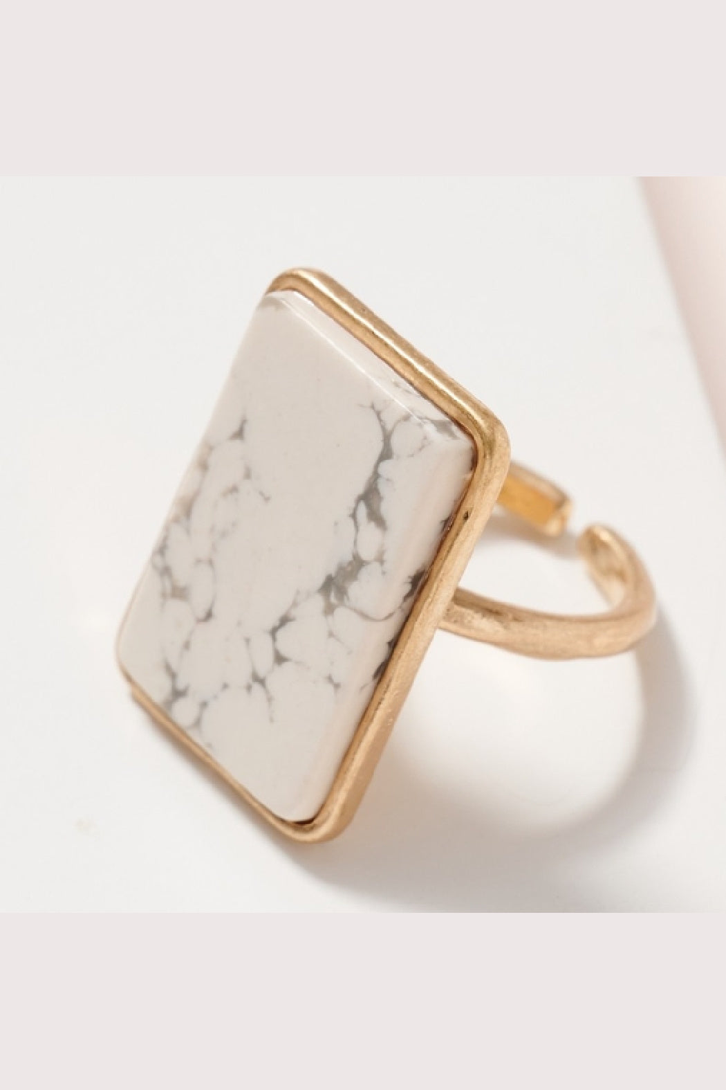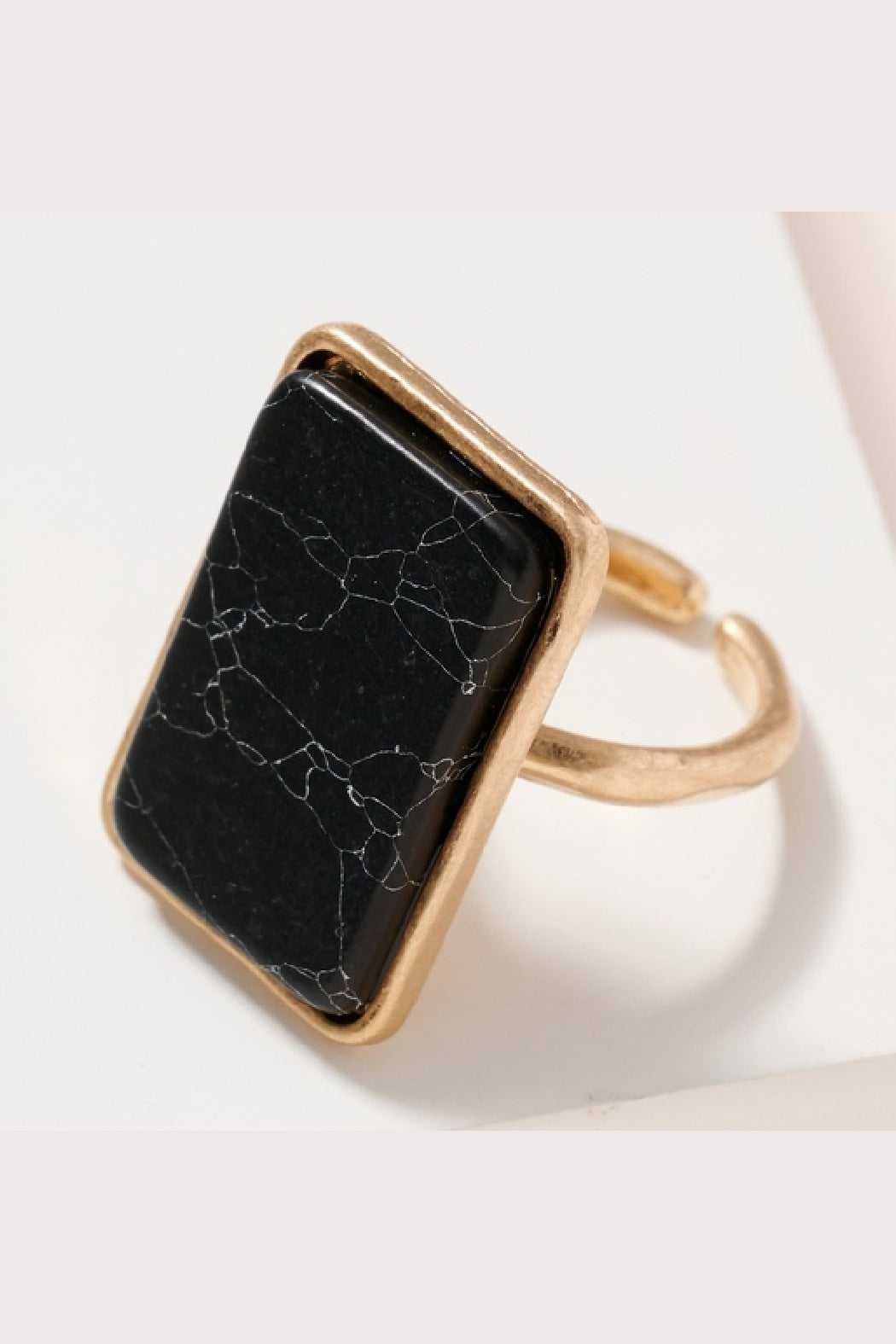 We love every color of this open ring with rectangular shaped semi precious stones. Such a fun statement piece!