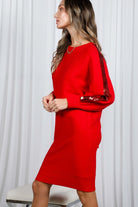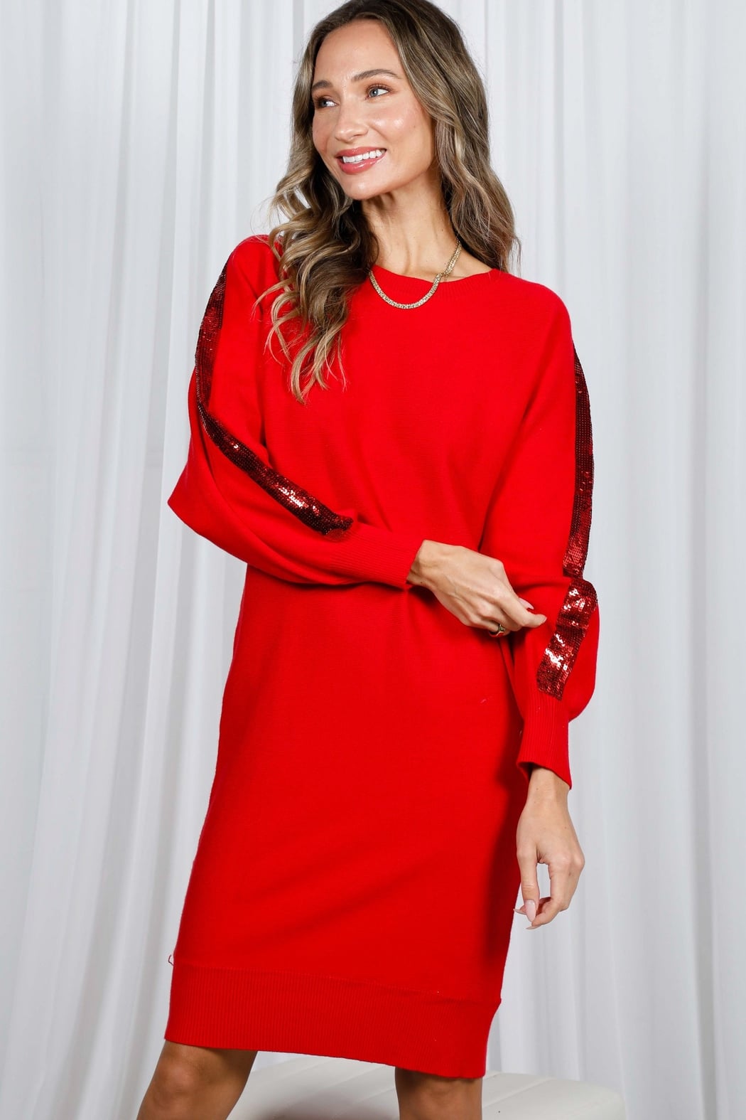 A cozy sweater dress accented with sequin stripes along the sleeves, the Sequin Sleeve Sweater Dress blends comfort with holiday-ready sparkle. The knit fabric offers a relaxed, straight silhouette that falls to a flattering midi length. Long sleeves and ribbed hemline keep the look classic while the embellished sequin detail adds a modern, night-out edge. Wear it with boots or heels for easy daytime-to-evening versatility.