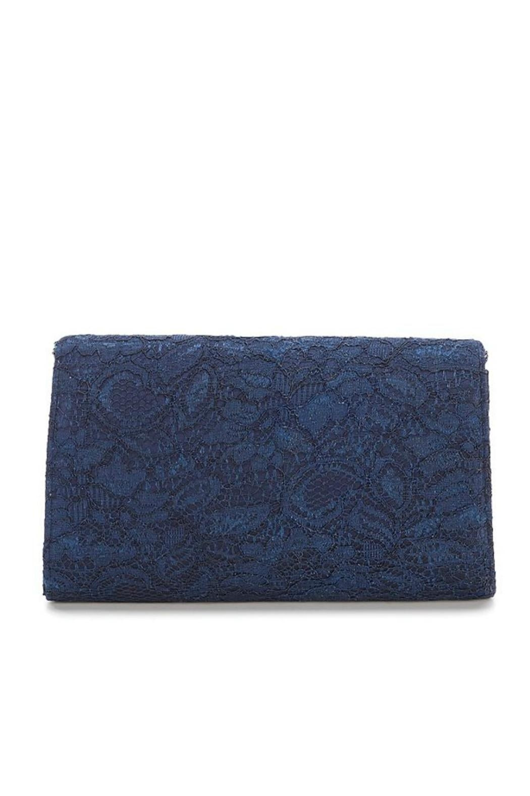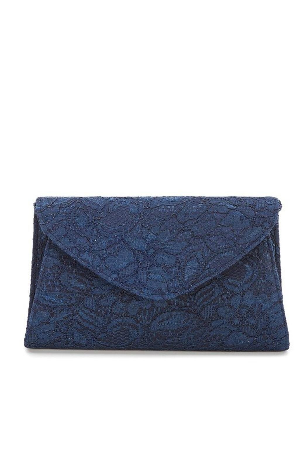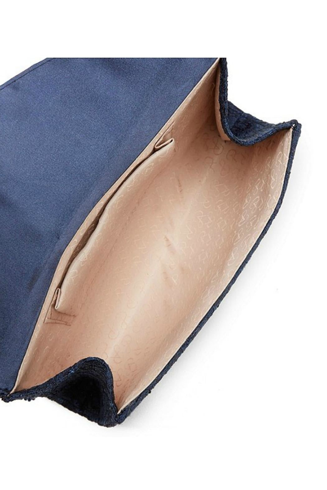 This is the Seta Clutch from Adrianna Papell, in the color "Midnight" (Navy Blue). Use it as a shoulder bag with the delicate double strand navy iridescent seed bead strap, or tuck the strap inside and use it as a clutch. It features a gorgeous polyester brocade lace fabric on the outside with a magnetic snap closure under the envelope flap. Logo-patterned beige polyester lining. Inside back wall pleated pocket. Click on "Mimi's Gift Gallery" on this page to find other special occasion handbags. Dimensions: Approx. 9.5" x 5.5" x 2"; with a 45" beaded strap (22" strap drop).