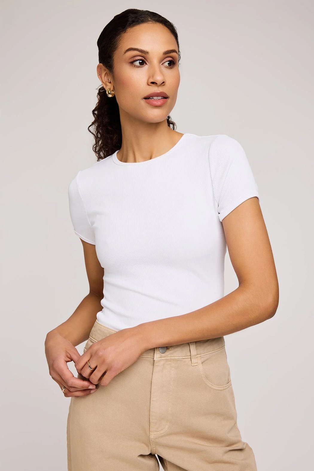 The Shania t-shirt is made of a soft and stretchy ribbed fabric that hugs the body. Features include a crew neckline and binding detail at the sleeve hem.