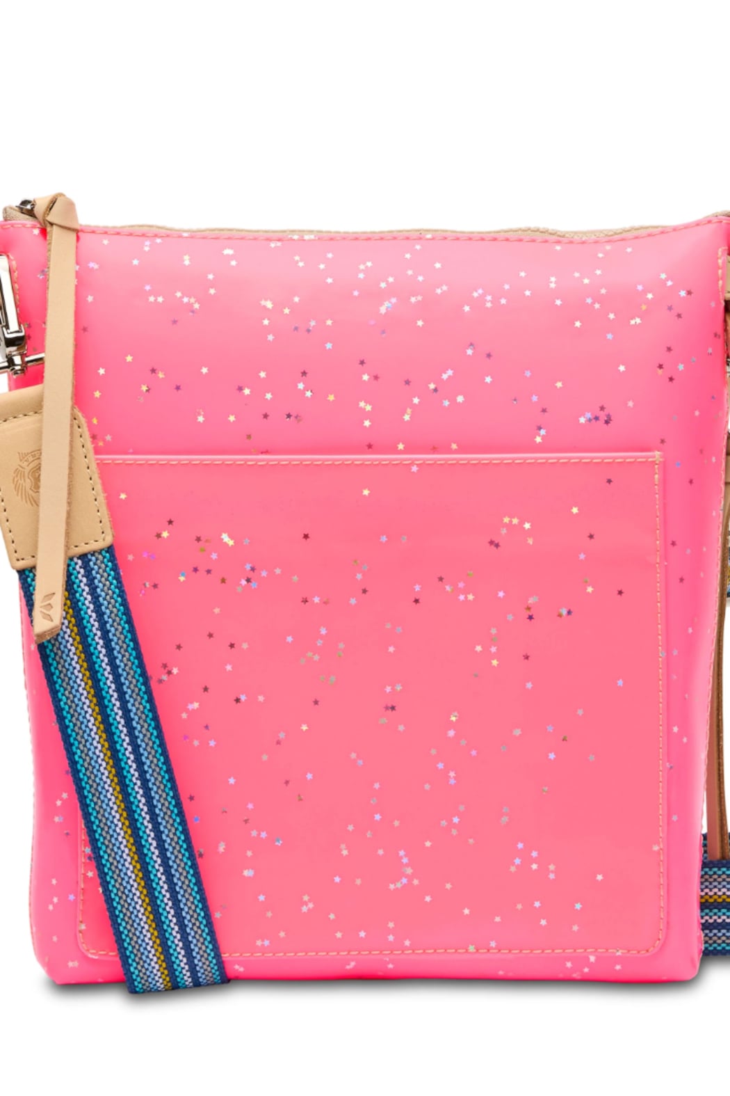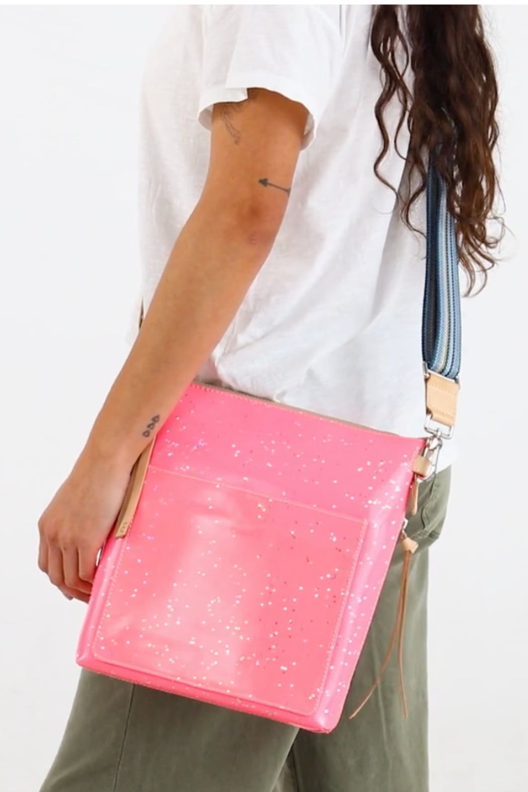 A compact, glitter-speckled crossbody built for easy everyday style. The Shine Tour Crossbody pairs a glossy, coated exterior with an adjustable woven strap for hands-free wear. Consuela crafted this bright shoulder bag with durable, easy-care materials and a flat front pocket for quick access. It's designed for on-the-go city days and relaxed, off-duty outings.