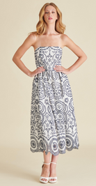 This beautiful white with navy eyelet dress is so pretty and elegant.