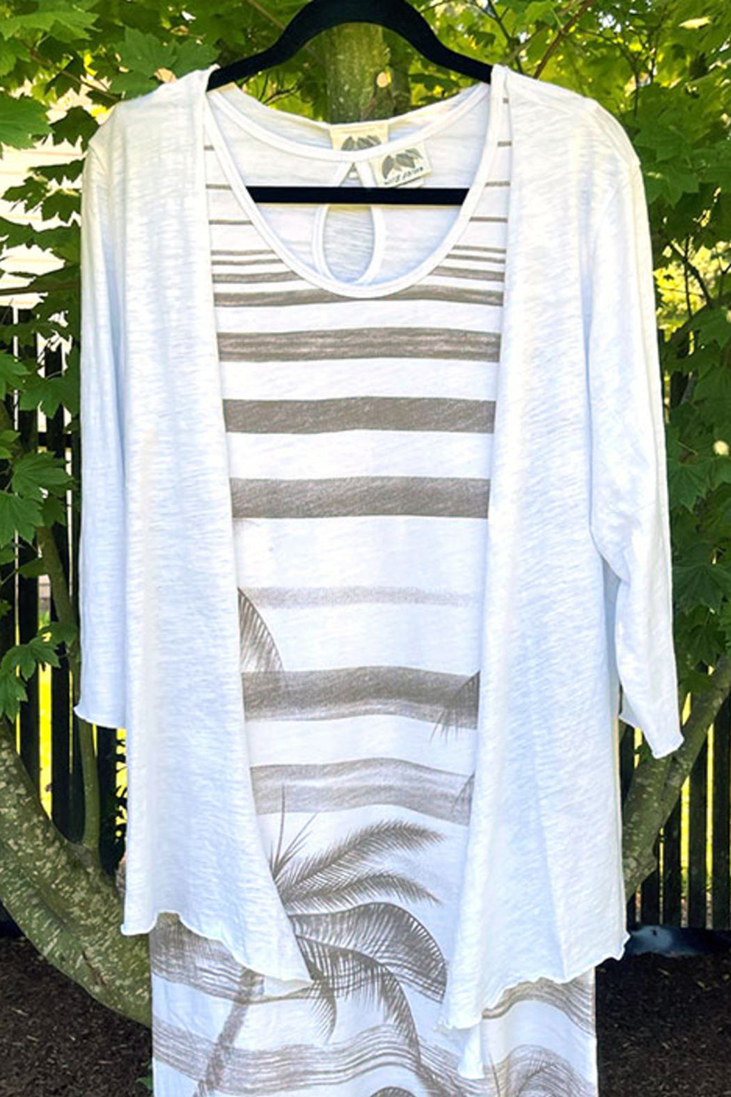 Lightweight and stylish, this little shrug cardigan is open fronted and very lightweight 100% cotton tee shirt fabric. The best part is the pretty lettuce edged bottoms on the 3/4 sleeves and the dipping hemline.