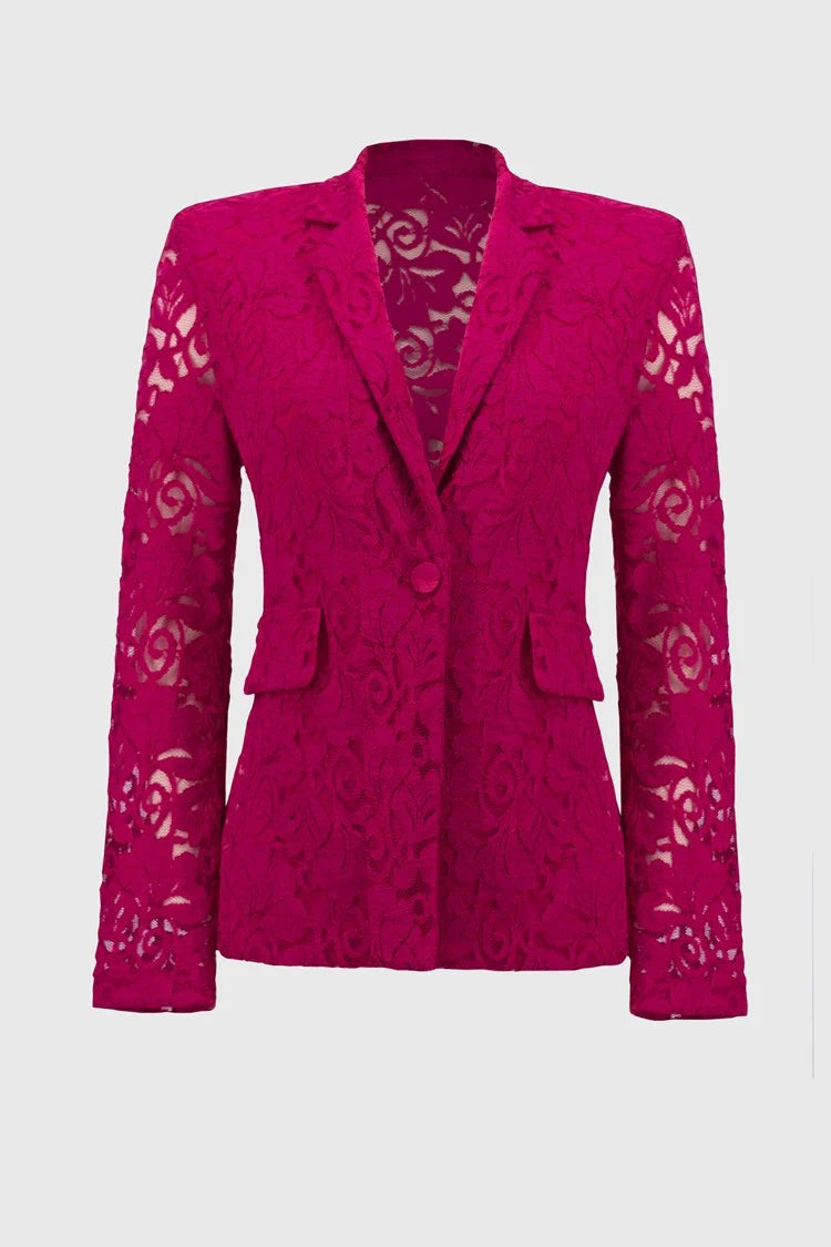 Floral corded lace brings a romantic touch to this structured blazer, making it an elegant choice for your next event. A classic notched collar, long straight sleeves, and faux pocket flaps complete this lovely piece. Part of the Signature collection.