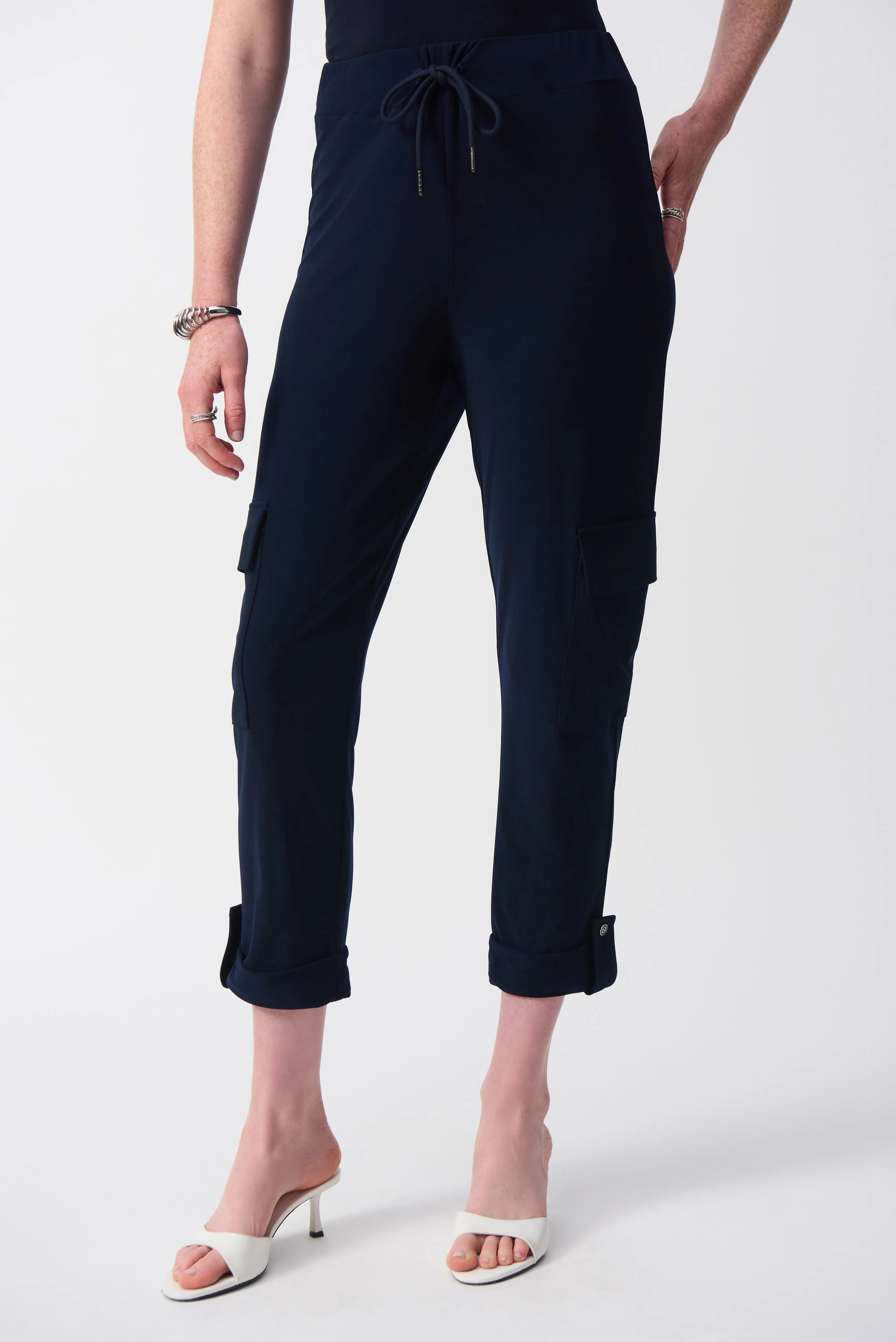 Elevate your look with these silky knit pull-on pants. The jogger silhouette adds bold flair to this piece crafted with a separated shirred waistband and chic decorative string with cord ends. Side cargo pockets and leg cuffs with tabs and buttons seamlessly combine style and versatility to this sleek design.