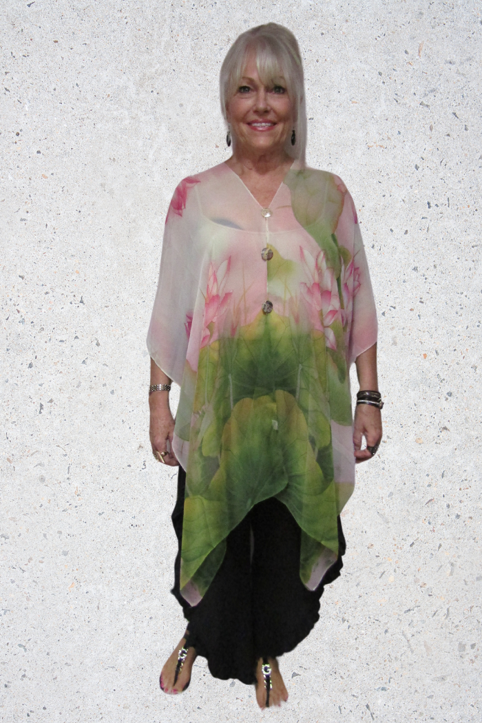 SILKY SHEER PONCHO - Green/Pink Lotus