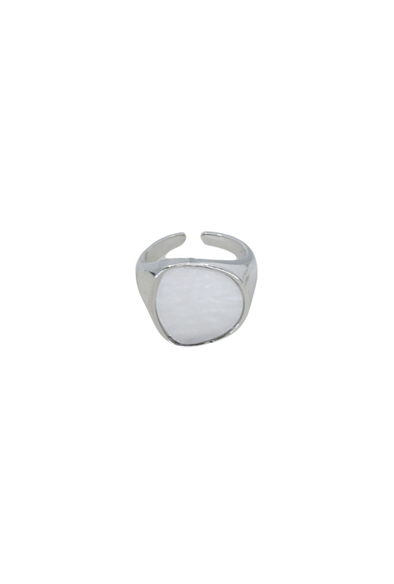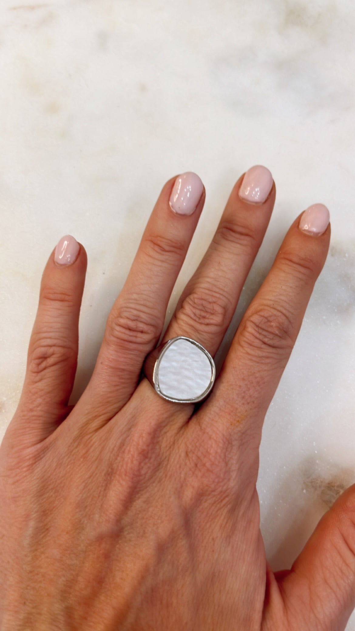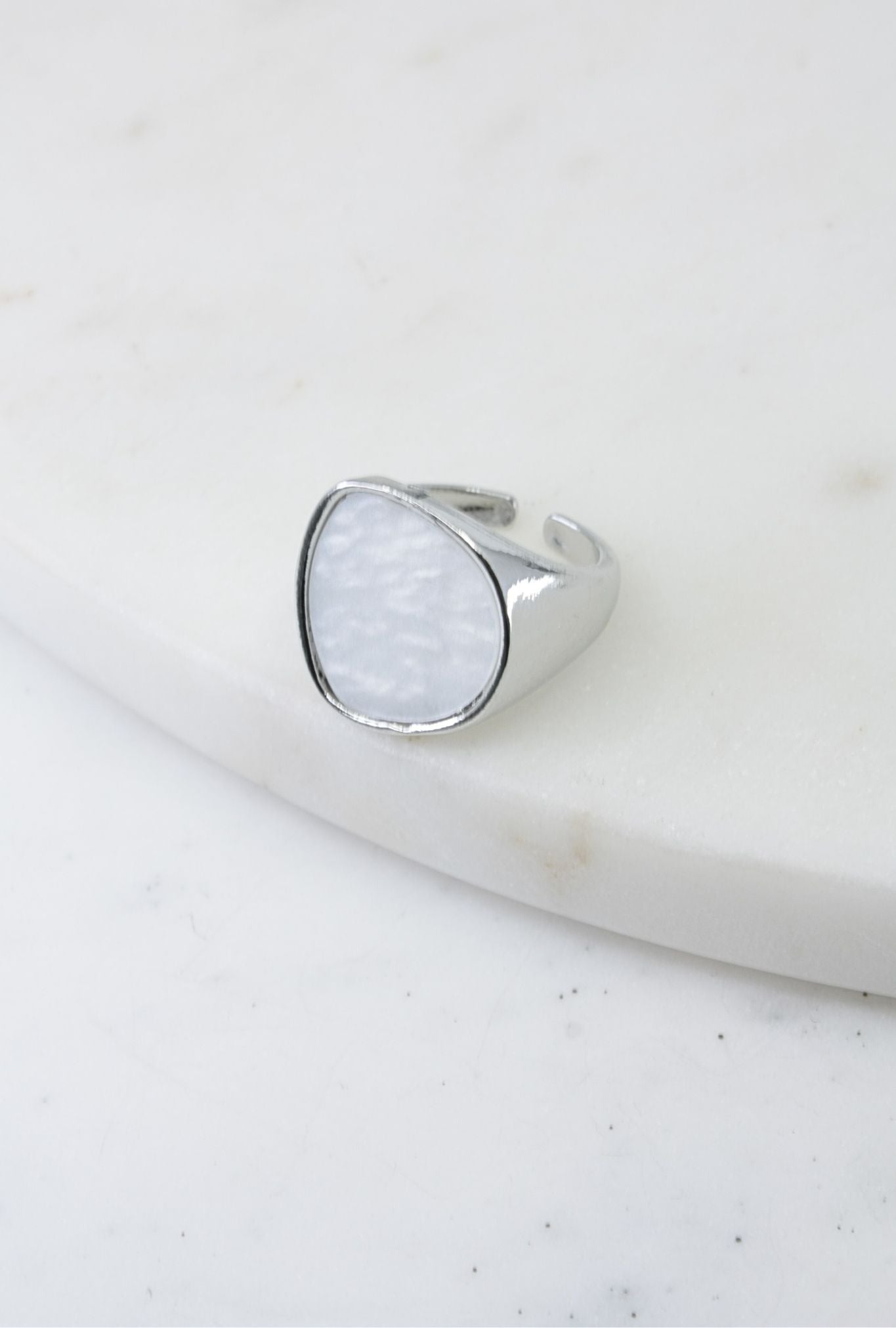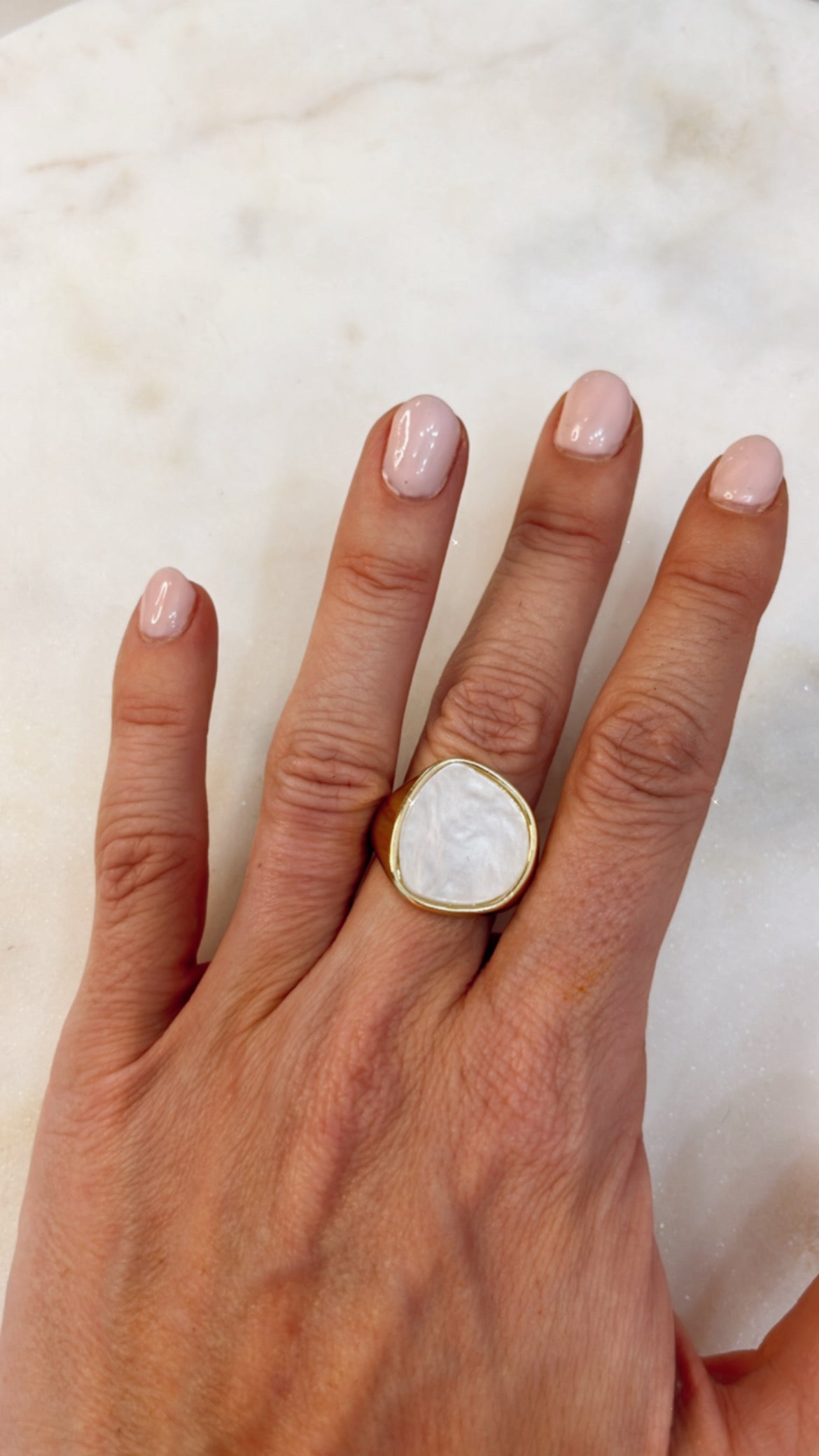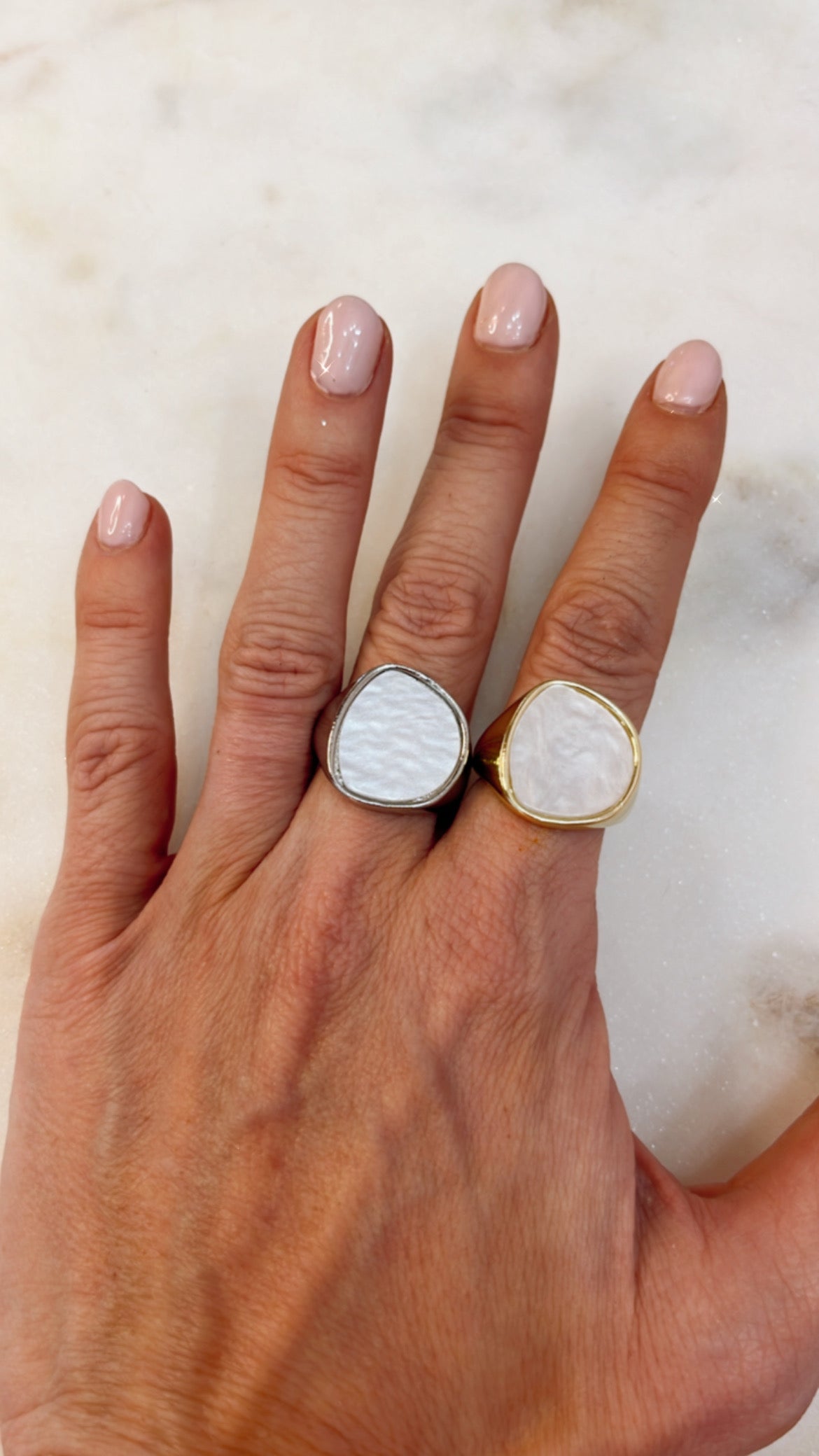 An adjustable sized ring with a pearlized acrylic face. Available in gold or silver.