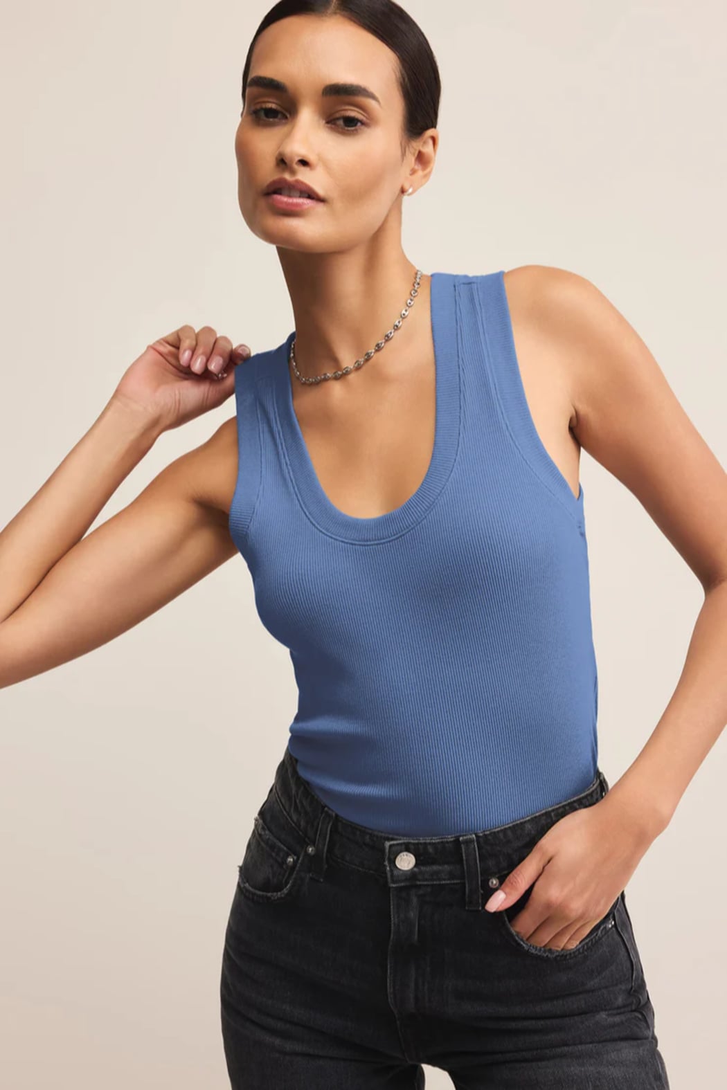 One of our most popular Essential tanks, made of our softly textured feather rib fabric, is a must-have whether worn on its own or as a fitted layer. We love this basic bra-friendly tank tucked or untucked.