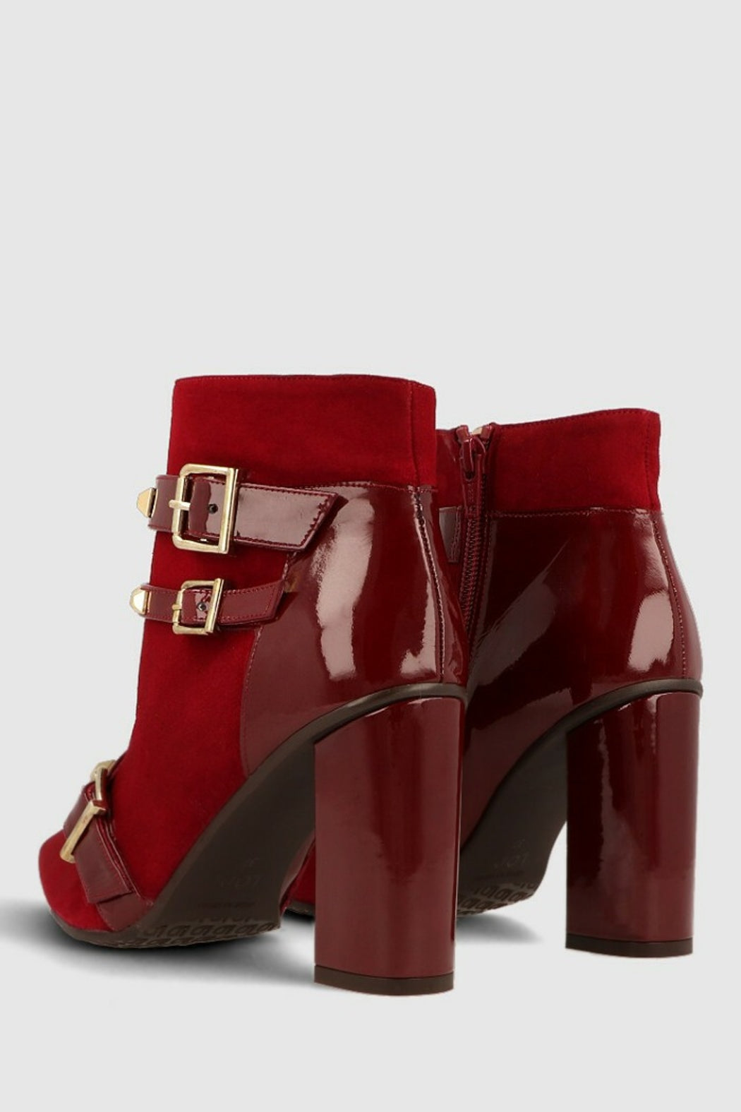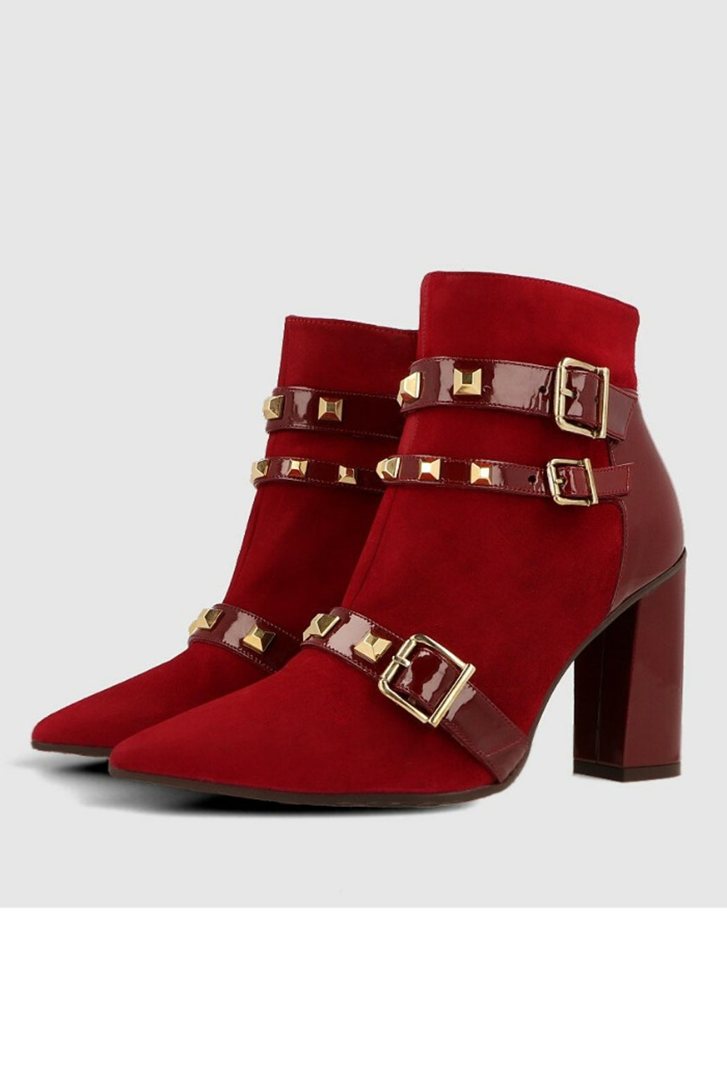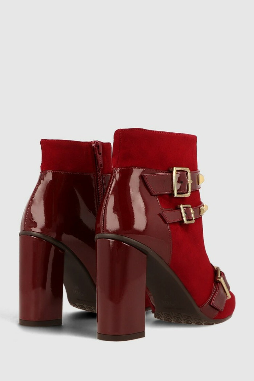 Siro by LODI ankle boots combined in red suede and patent leather. It has a detail of golden metalwork. Square heel 9 cm high. The Siro ankle boot incorporates a new gel insole so that you are comfortable in each step. It has a side zip closure. Gold metalwork with pyramid stud detail. A perfect ankle boot to combine with your winter looks.