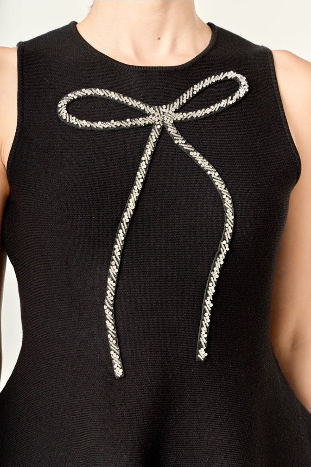 Sleeveless Knit Crew Neckline Peplum Rhinestone Bow Detail Hand Wash Cold Do Not Bleach Do Not Tumble Dry Iron Low Shell: 72% Viscose, 28% Polyester CREAM: Height 5'9" / Bust 31.5" / Waist 23.5" / Hip 33.5" BLACK: Height 5'9" / Bust 31.5" / Waist 23.5" / Hip 33.5"
